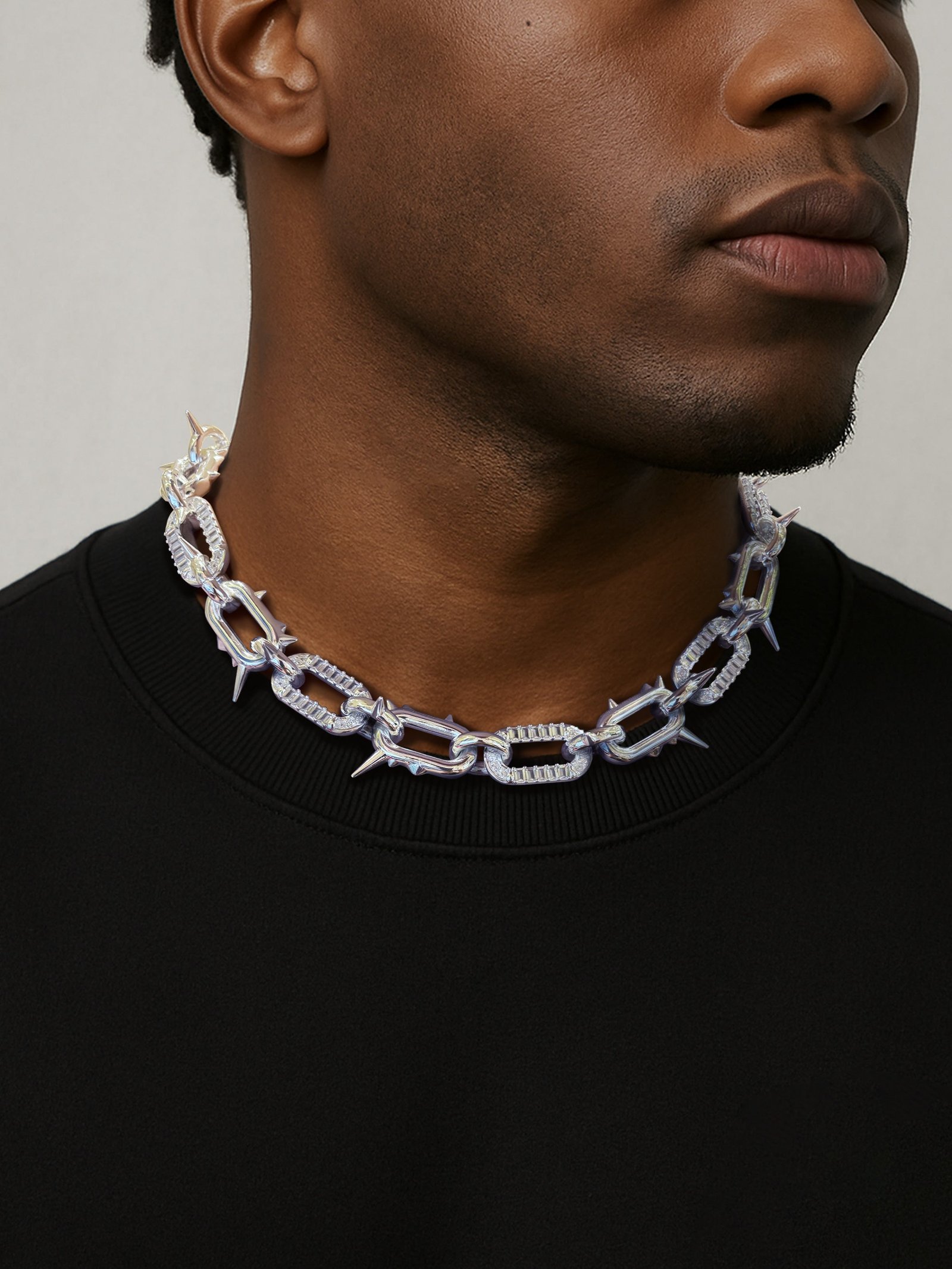 Exclusively designed by HOWSS. AFTERBURN follows the blast of SUPERNOVA — a chain forged in the heat that lingers after impact. Angular spikes and gem-set links catch the light like scattered debris. locked into a silhouette that burns cool and cuts deep. It’s not just an accessory — it’s the aftershock.
