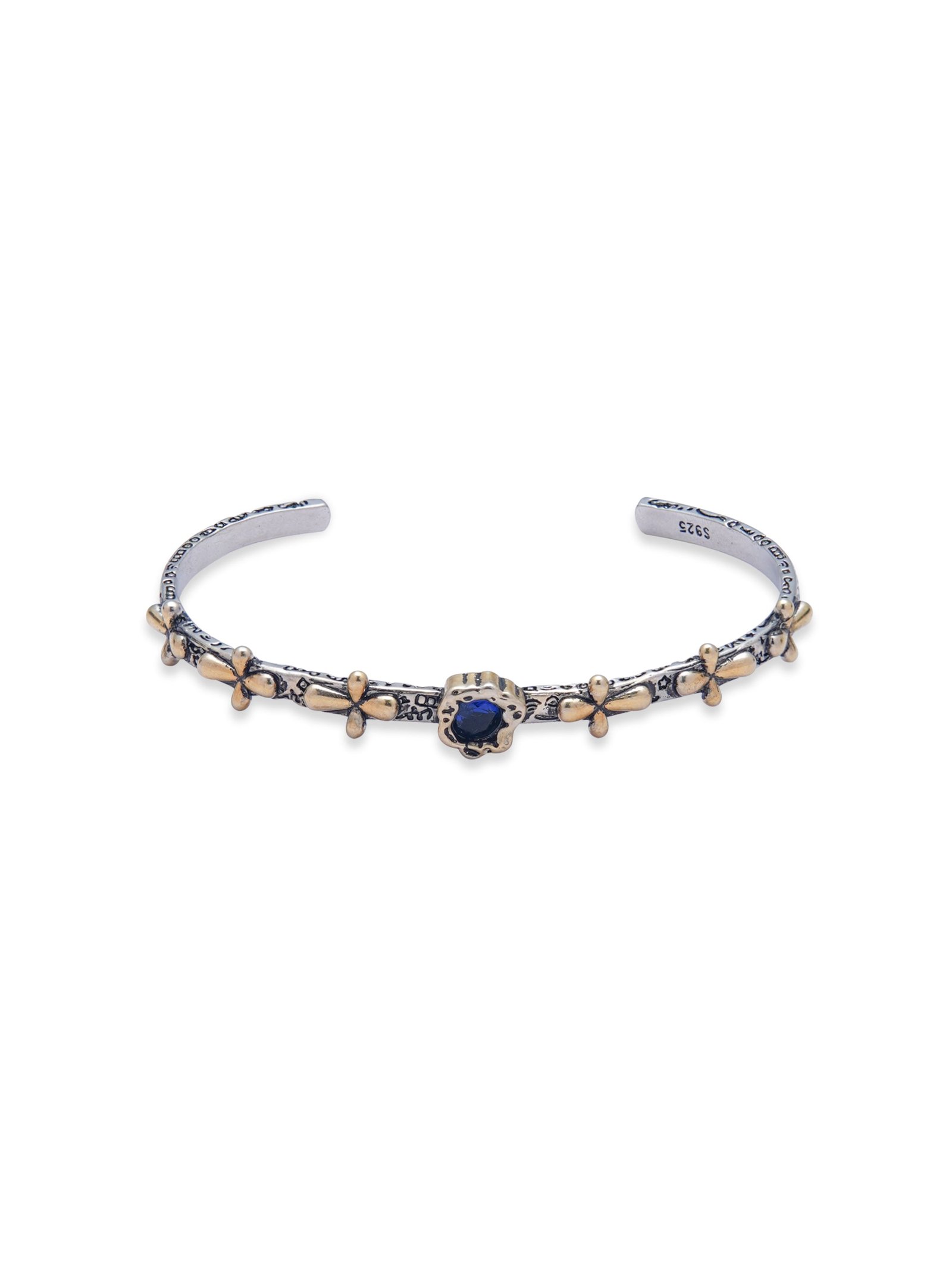 Crafted from electroplated copper. this vintage-inspired cuff bracelet features a striking mix of aged textures and ornate detailing. Golden floral motifs line the band. while a deep blue centerpiece adds a regal touch. With its open design and aged silver-tone finish. this piece blends antique elegance with a modern gothic edge. It’s a refined yet bold statement for any look.