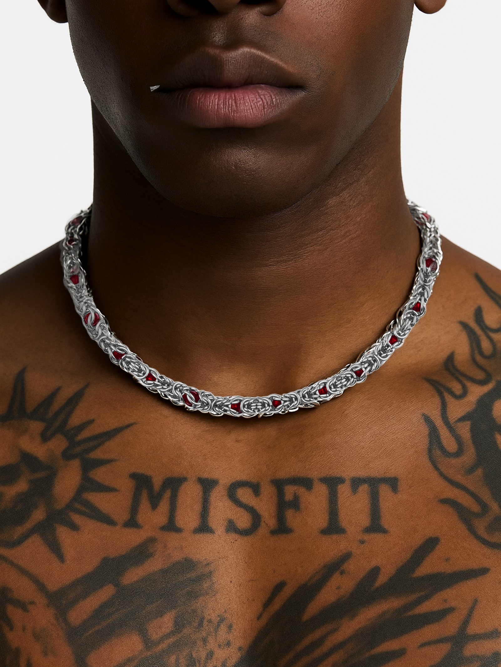 This necklace interweaves polished titanium steel with deep red handmade stone beads. weaving it into an armor-like structure. The smooth metal ring contrasts with the vibrant stone core. creating a restrained tension and clear texture. Equipped with an adjustable extension chain. it is easy to adjust the wearing comfort while maintaining its bold sculptural feel.
