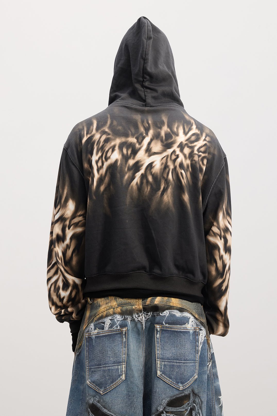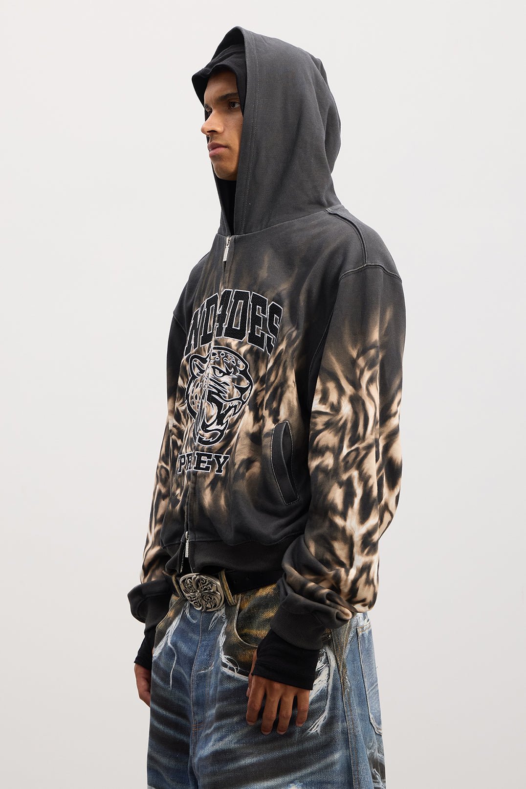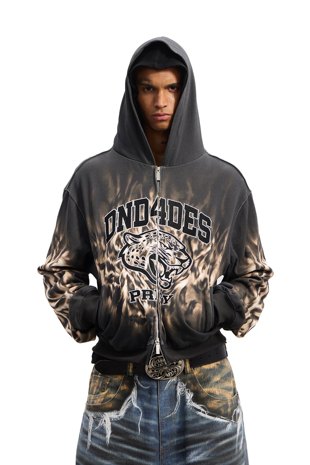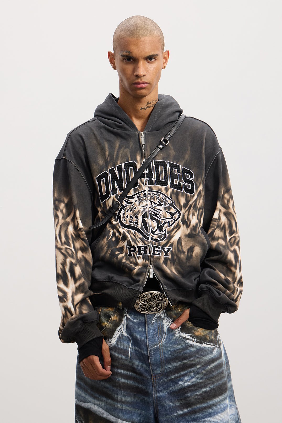 Unleash a wild presence with a full-surface bold leopard print — untamed yet never excessive. What sets it apart is the heavywork academy-style embroidery — dark. intricate emblem-inspired patterns and pentagram stitches subtly woven into the design. clashing intensely with the feral base. It’s a perfect embodiment of rebellious street spirit. Soft-touch fabric and a boxy silhouette elevate its laid-back attitude. making you effortlessly stand out without trying too hard.