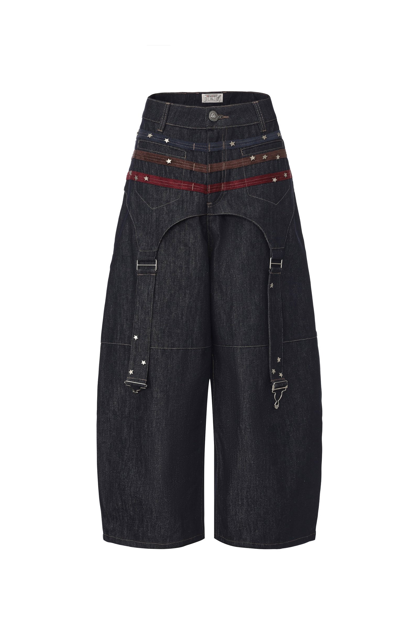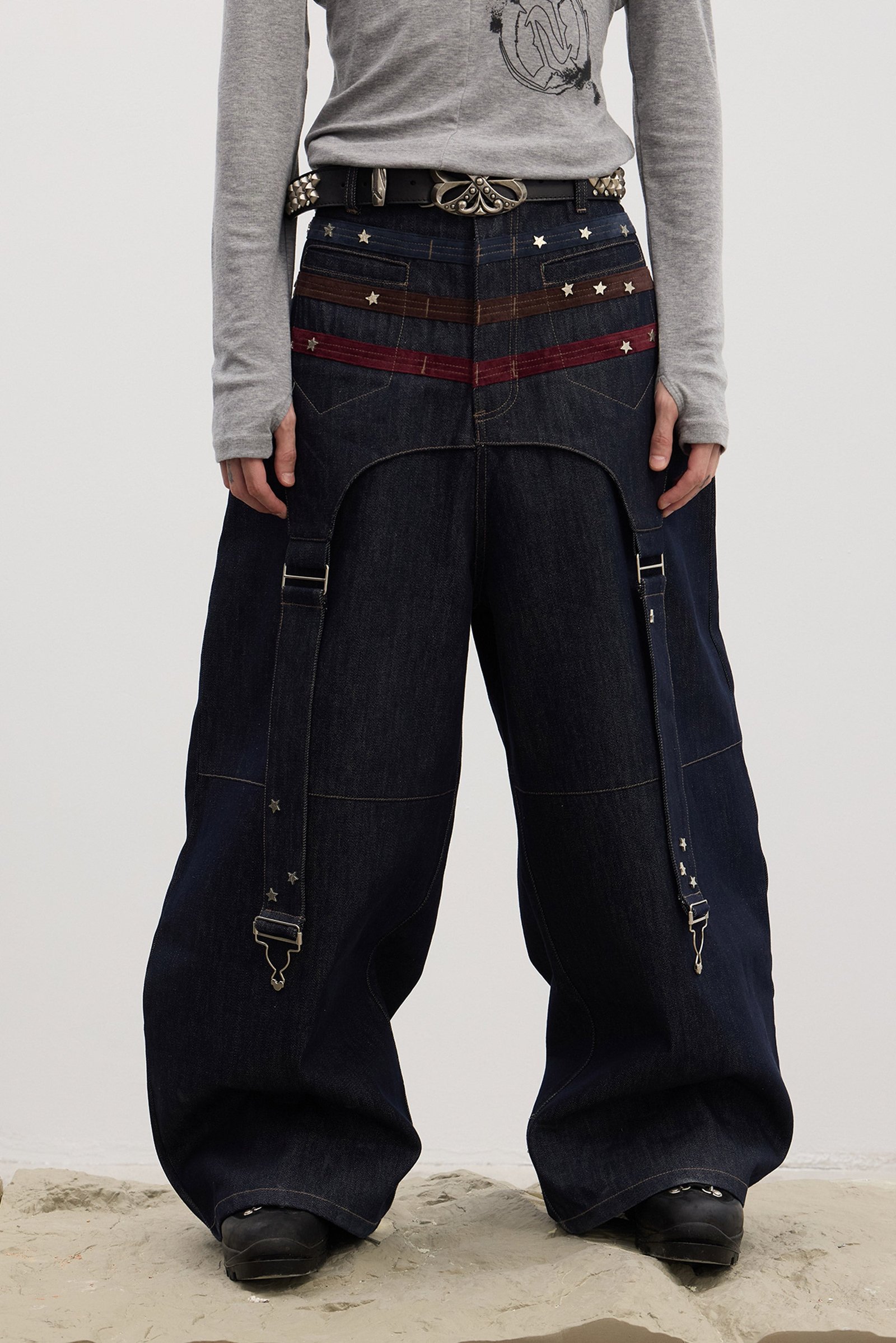 Don’t be bored by the cookie-cutter raw denim on the market anymore! This pair will definitely challenge your perception of raw denim. The colorful suede-textured webbing and the unique star-shaped hardware create a unique Y2K color scheme. The overall structure adds a layered feel and a more stylish look. The raw denim fabric has a premium sheen and texture. and the reactive dyeing process makes it even more resistant to fading.