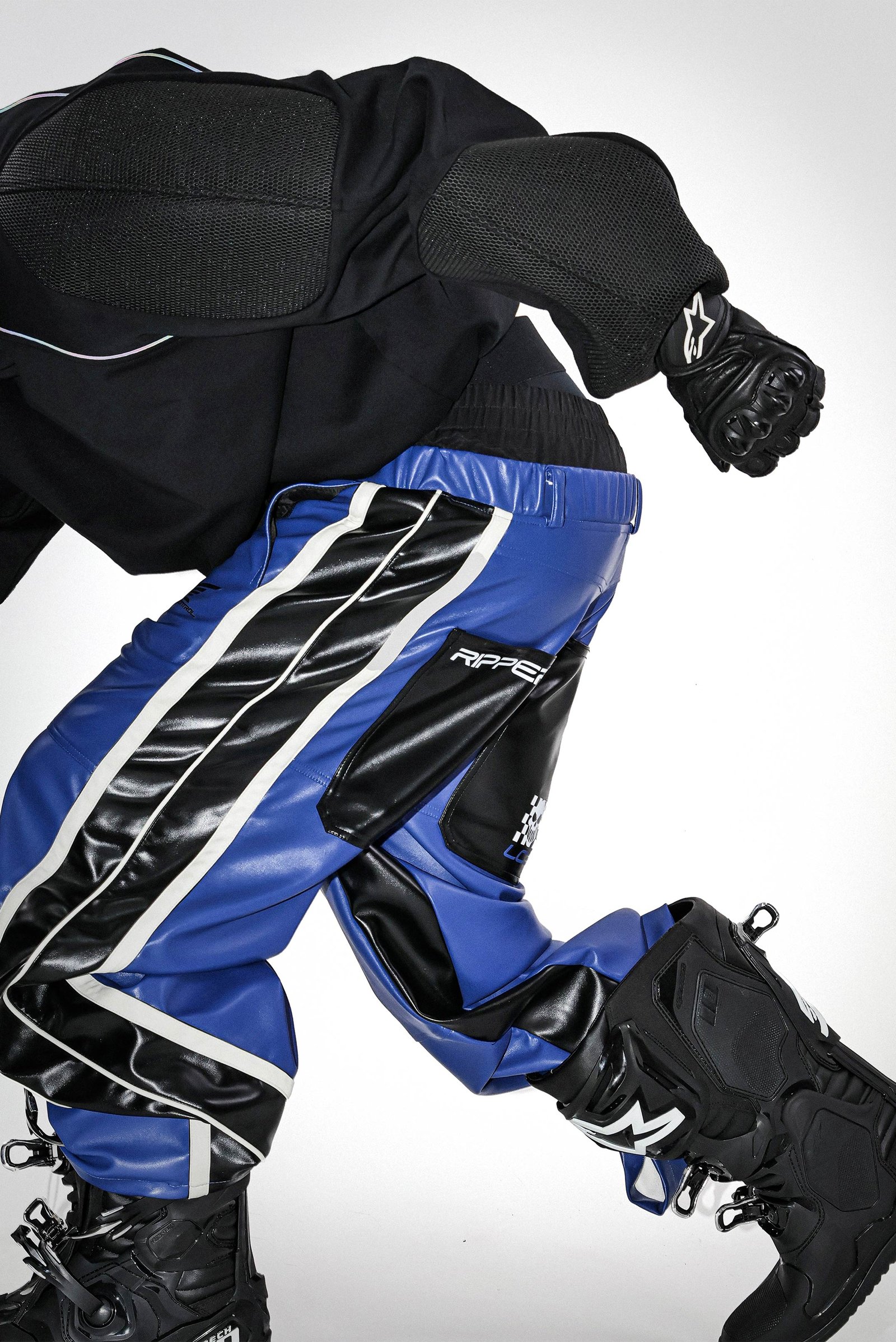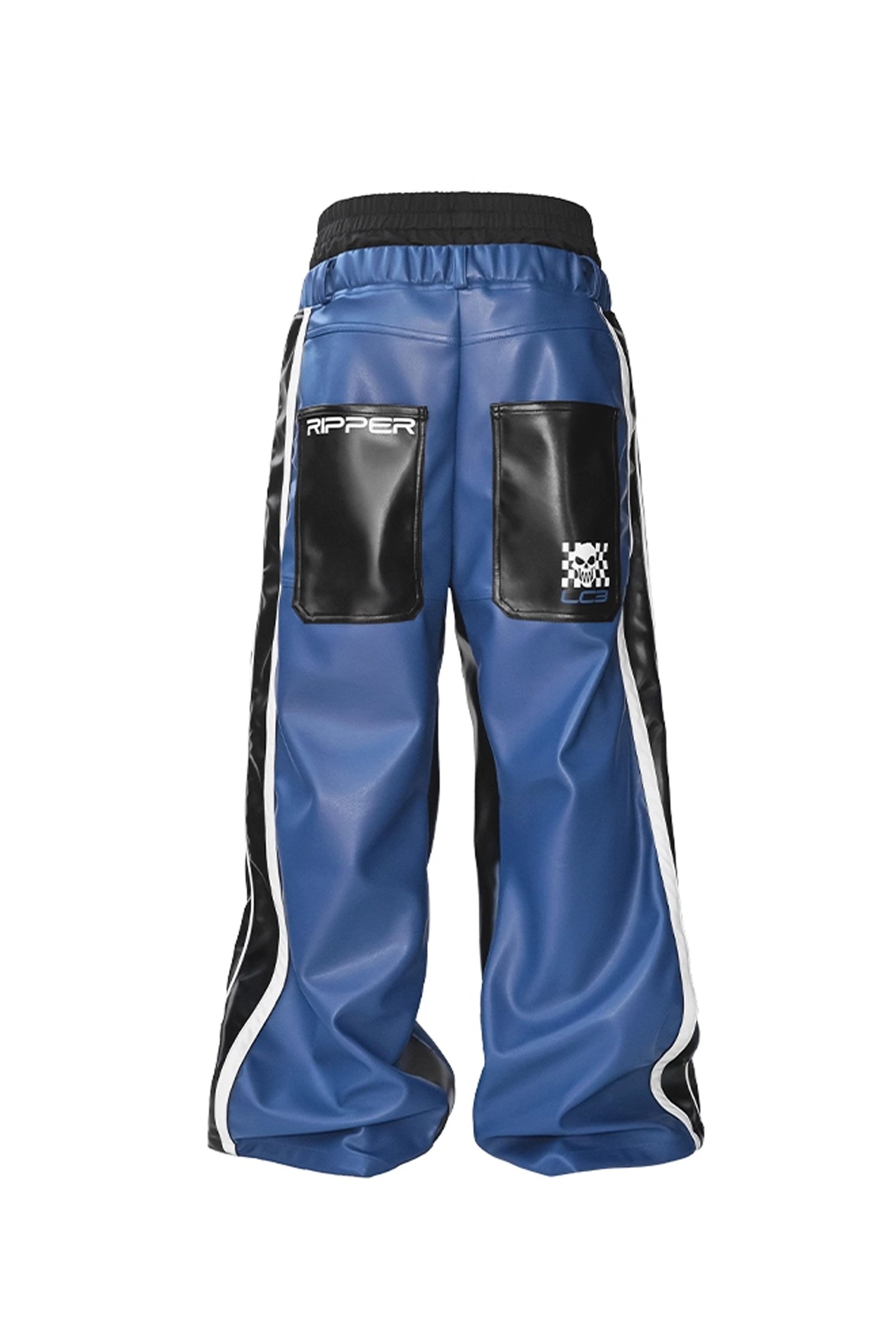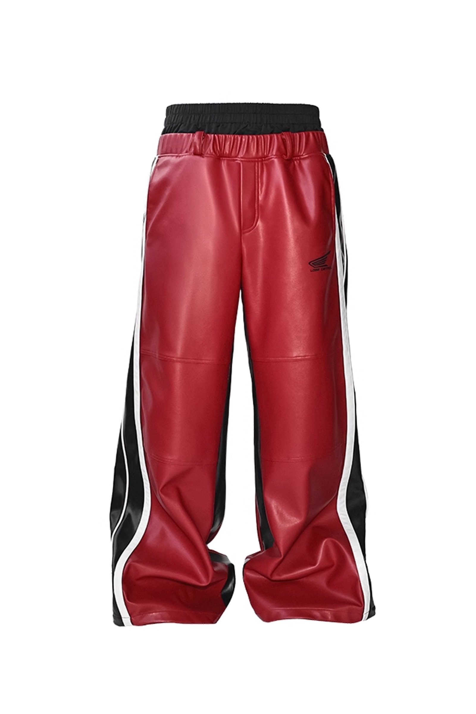 • Features tri-color faux leather patchwork with a dual waistband design. adding layers of detail and depth.