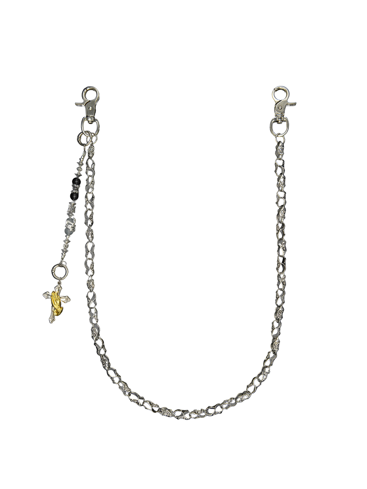 Handcrafted with a titanium-inspired finish on a durable alloy core and designed exclusively by HOWSS. this piece resists rust. oxidation. and wear—no maintenance required. A classic skull chain anchors a sculptural pendant of symbolic contrasts: a dark bead. praying hands clutching a cross. a light gray stone. and a coiled serpent. Each detail balances rebellion with reverence—bold. intricate. and built with intention.