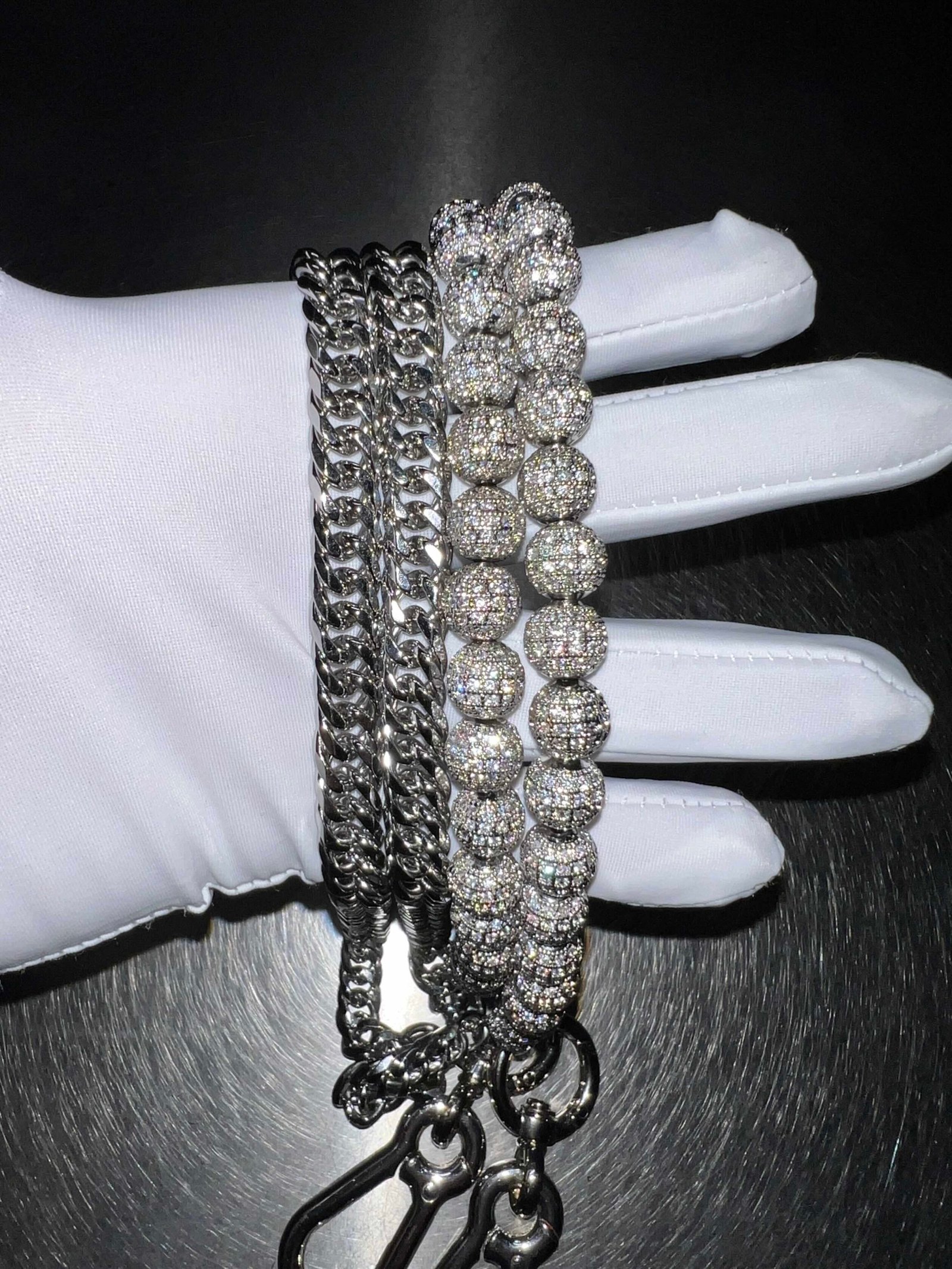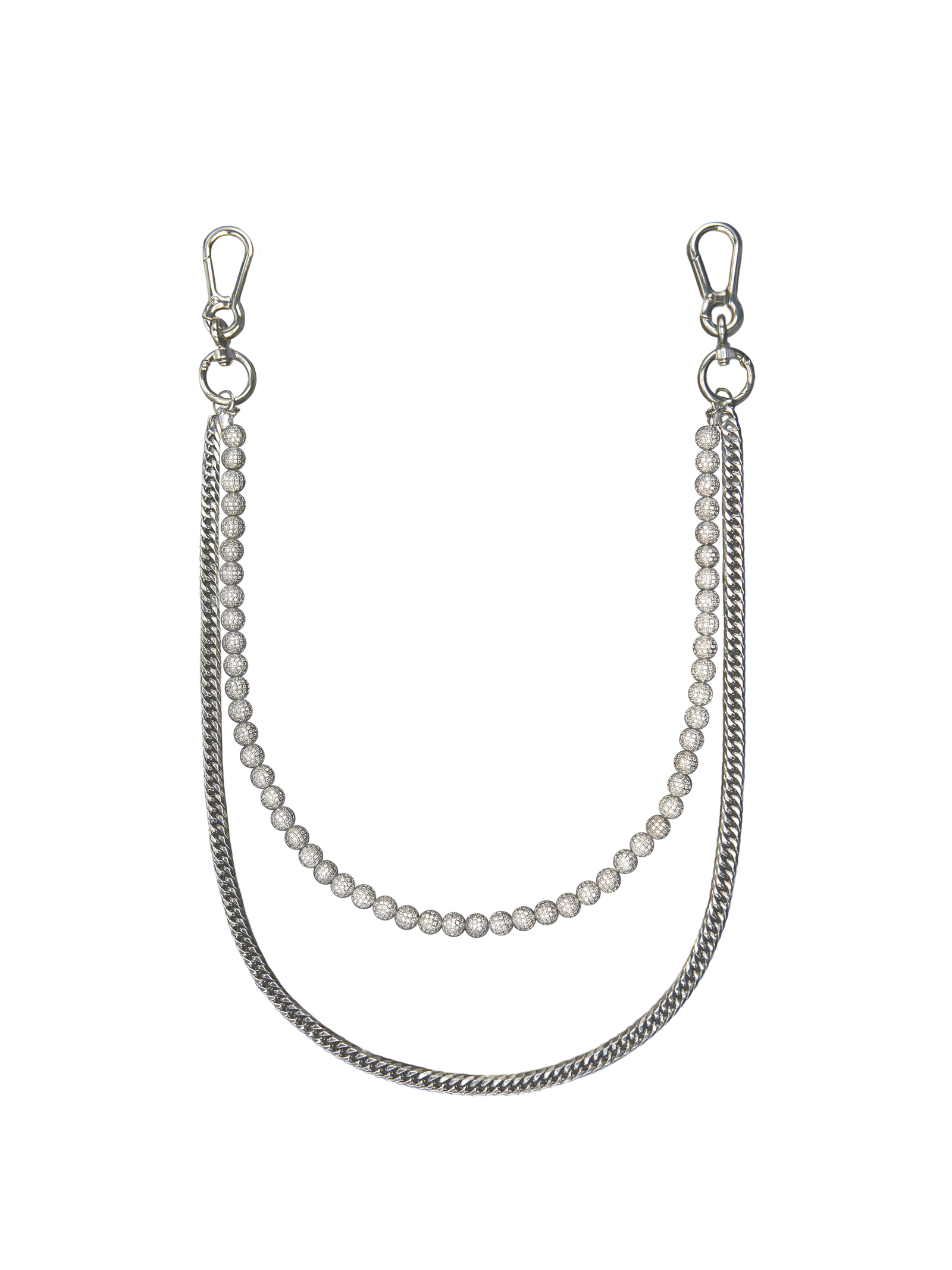 Handcrafted from premium titanium steel and designed exclusively by HOWSS. the chain is rust-proof. anti-oxidation. wear-resistant and maintenance-free. Its dual-chain structure brings layered depth. combining polished links with a full row of titanium beads—each meticulously hand-set with clear zirconia stones for a crystalline brilliance. The metal surface is specially treated to create a flowing light-and-shadow effect. delivering both visual impact and elevated detail. Every element is crafted with precision to reflect refined street luxury.