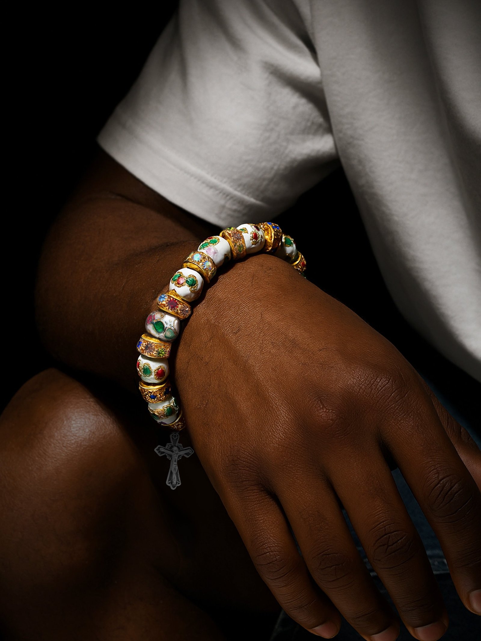 Handcrafted from vibrant artificial stones and gold-plated copper. this bracelet is a striking fusion of ornate detail and timeless symbolism. The design features alternating floral enamel beads and gemstone-accented gold-toned spacers. creating a rich. baroque-inspired aesthetic. A silver cross charm adds a touch of spiritual depth. contrasting beautifully with the warm gold and multicolor sparkle. The glossy finish and detailed craftsmanship offer both elegance and attitude. making this piece a bold statement of devotion and individuality.