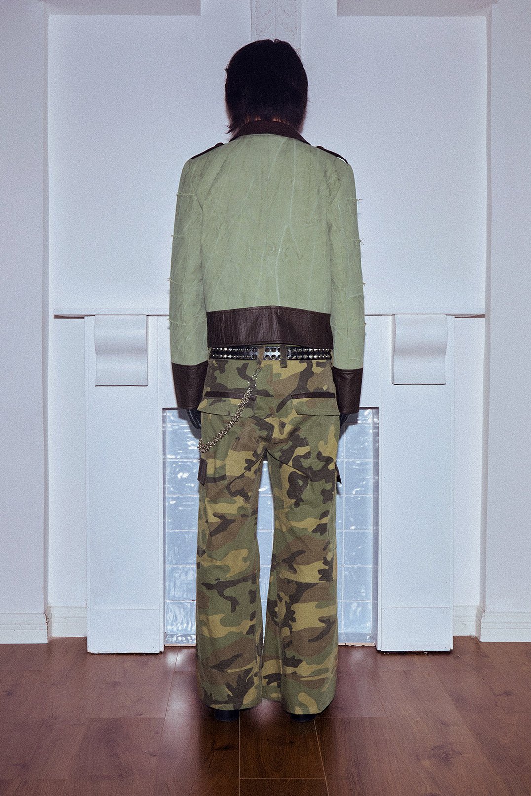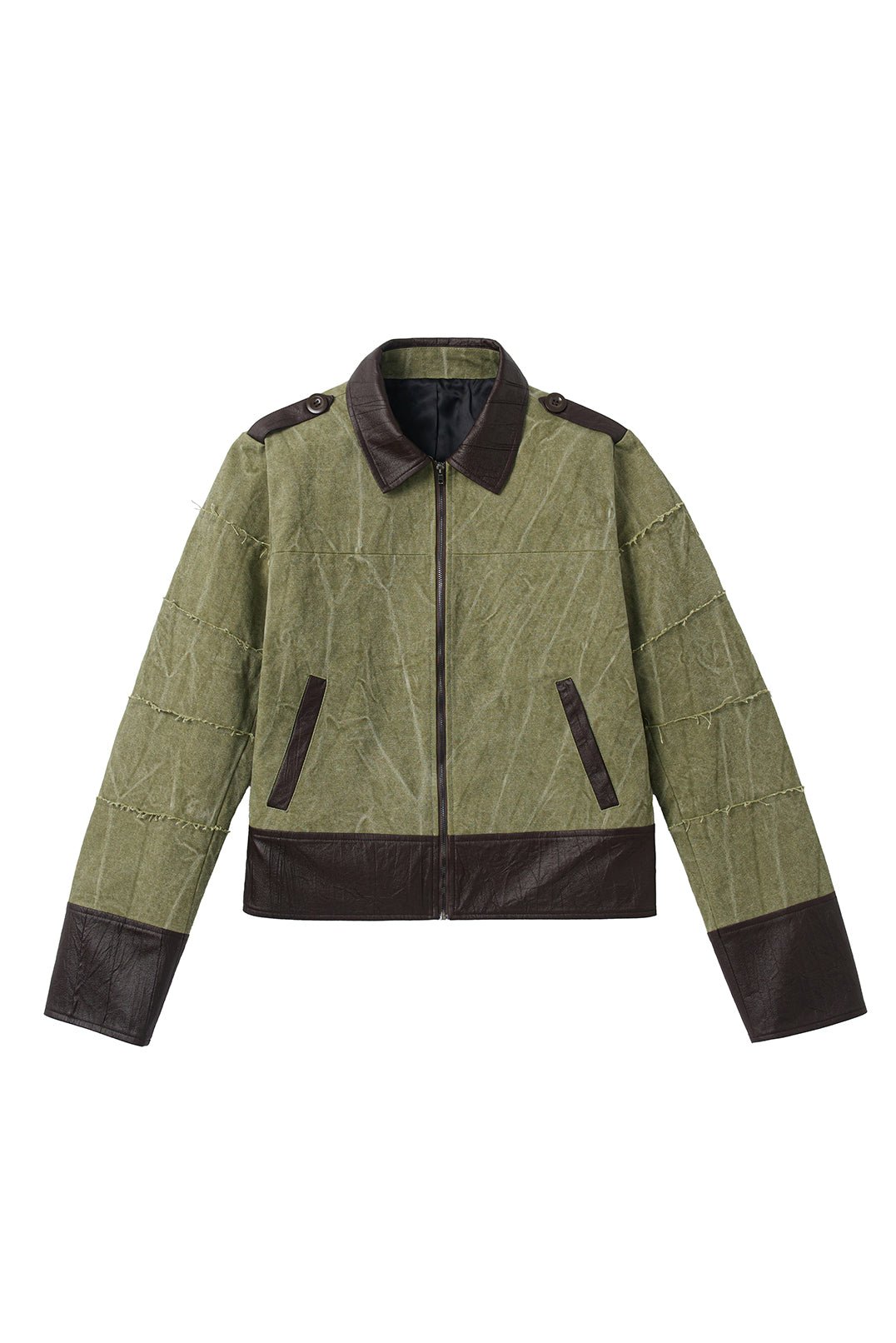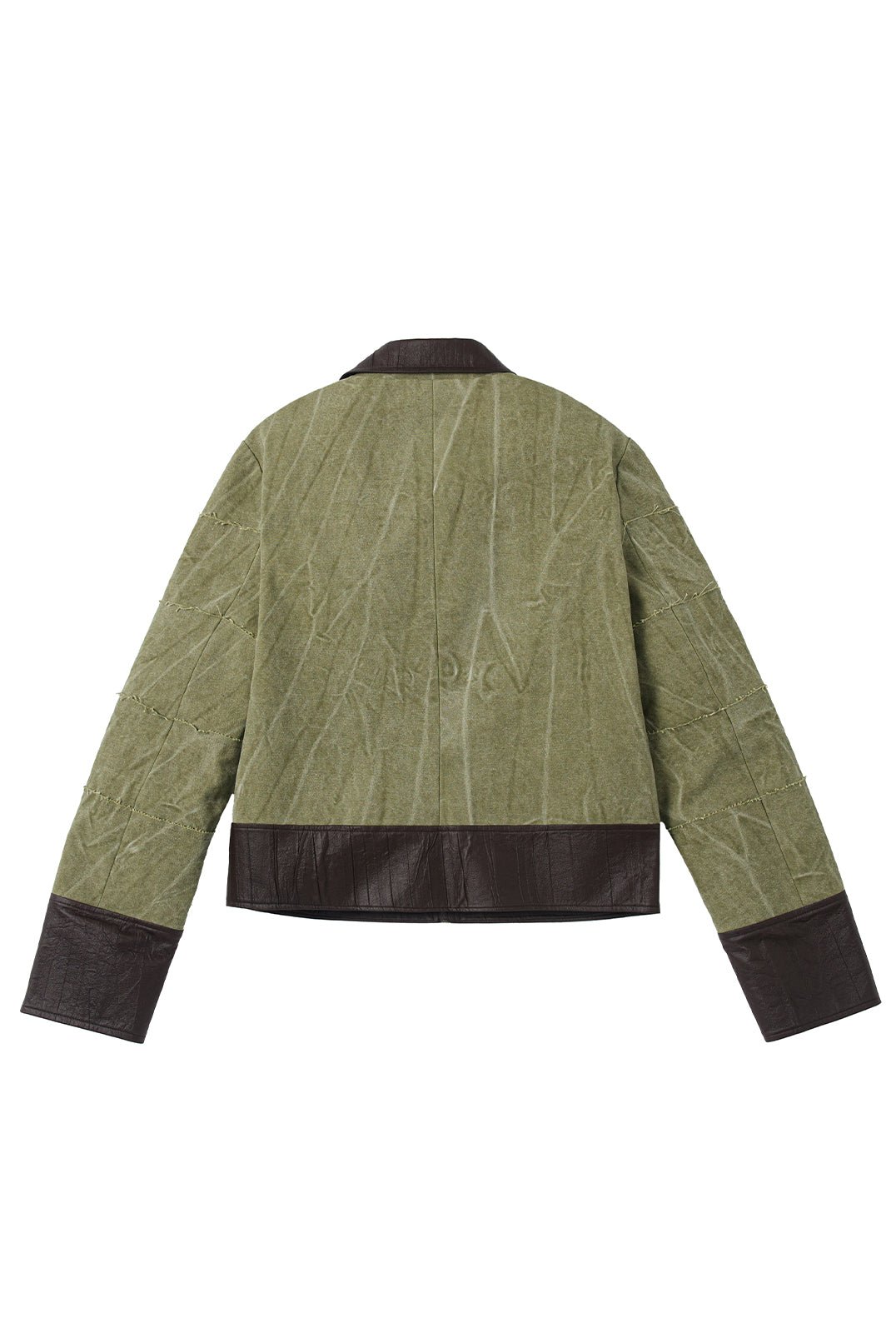 The jacket features a cropped silhouette. The armholes are inspired by bamboo joints. and the design is layered with multiple panels. The jacket draws inspiration from the Vietnam War depictions in Forrest Gump and the bamboo forest action scenes in A Touch of Zen. The color scheme perfectly blends the military green. a common element in military design. with the color of bamboo. The fabric is heavy canvas. contrasted with earthy leather. This jacket retains its military roots while infusing it with the uniquely Eastern martial arts spirit.