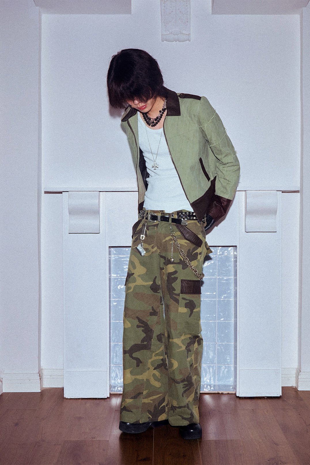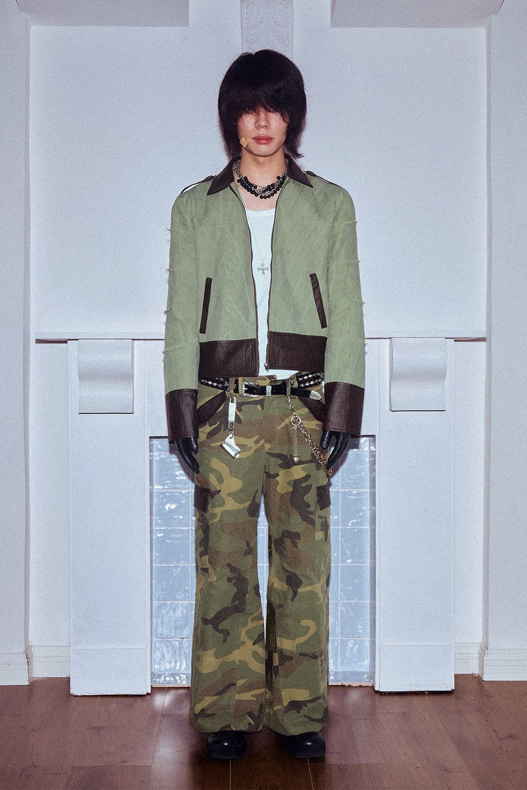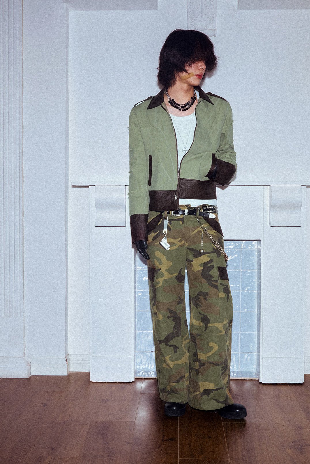 The jacket features a cropped silhouette. The armholes are inspired by bamboo joints. and the design is layered with multiple panels. The jacket draws inspiration from the Vietnam War depictions in Forrest Gump and the bamboo forest action scenes in A Touch of Zen. The color scheme perfectly blends the military green. a common element in military design. with the color of bamboo. The fabric is heavy canvas. contrasted with earthy leather. This jacket retains its military roots while infusing it with the uniquely Eastern martial arts spirit.