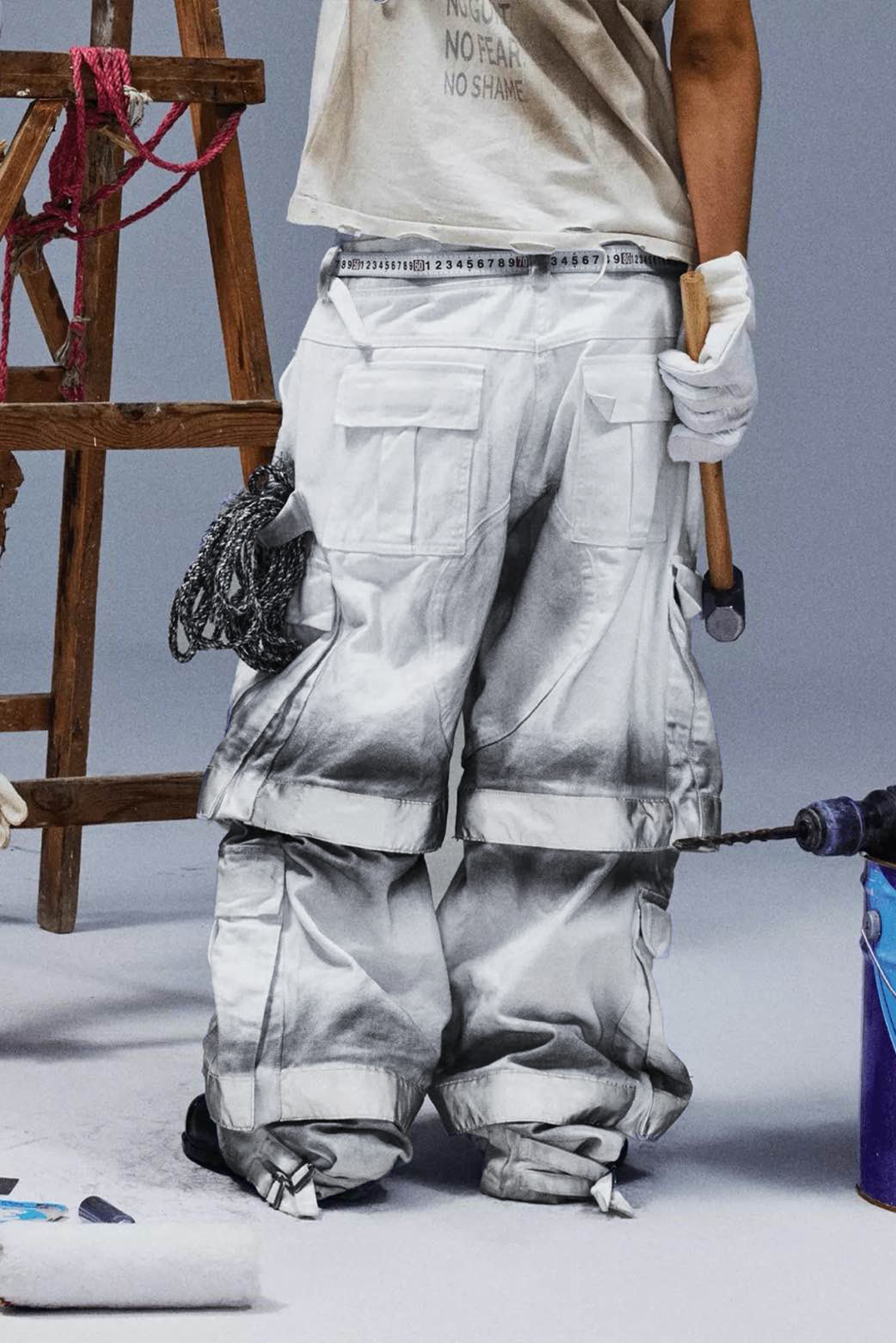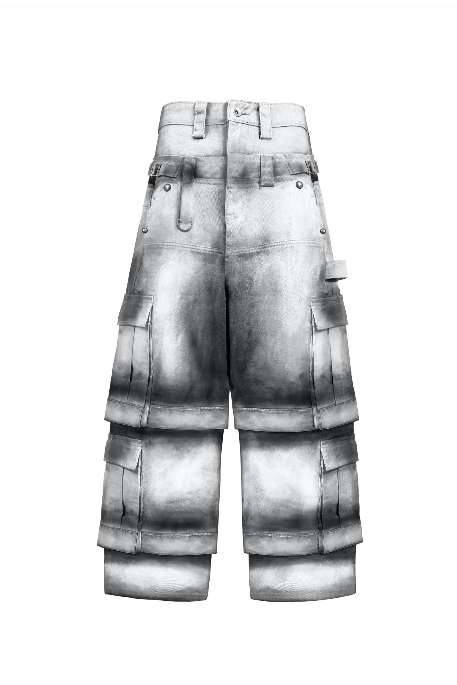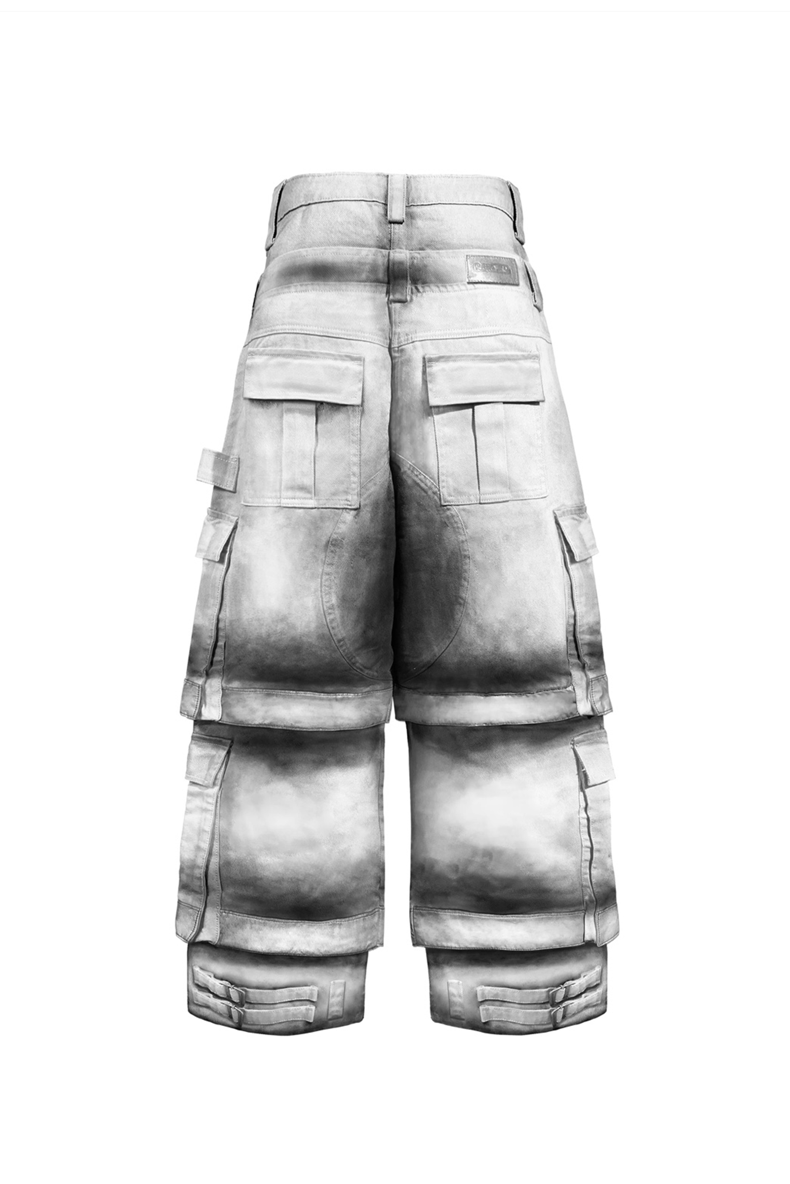 Pattern design:Select CARGO profile and double waist design / 3-IN-1 detachable design / Multi-pocket velcro design / Peflectme strip spucing design / Custom dirty dyeing to do old washing / Custom ancient silver LOGO rmets / YKK zipper