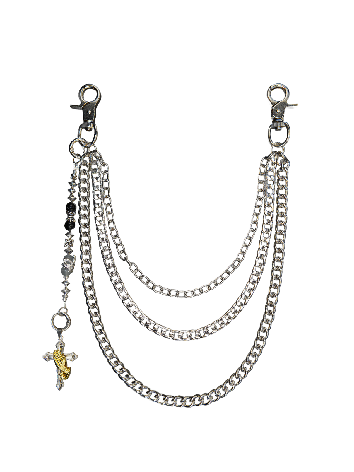 Crafted from high-durability titanium steel and designed by HOWSS. this piece resists rust. oxidation. and wear — no maintenance needed.Its triple-layered chain base combines raw texture with sculptural clarity. while symbolic crosses. praying hands. and coiled elements merge rebellion with reverence — each detail sharply defined with industrial edge.