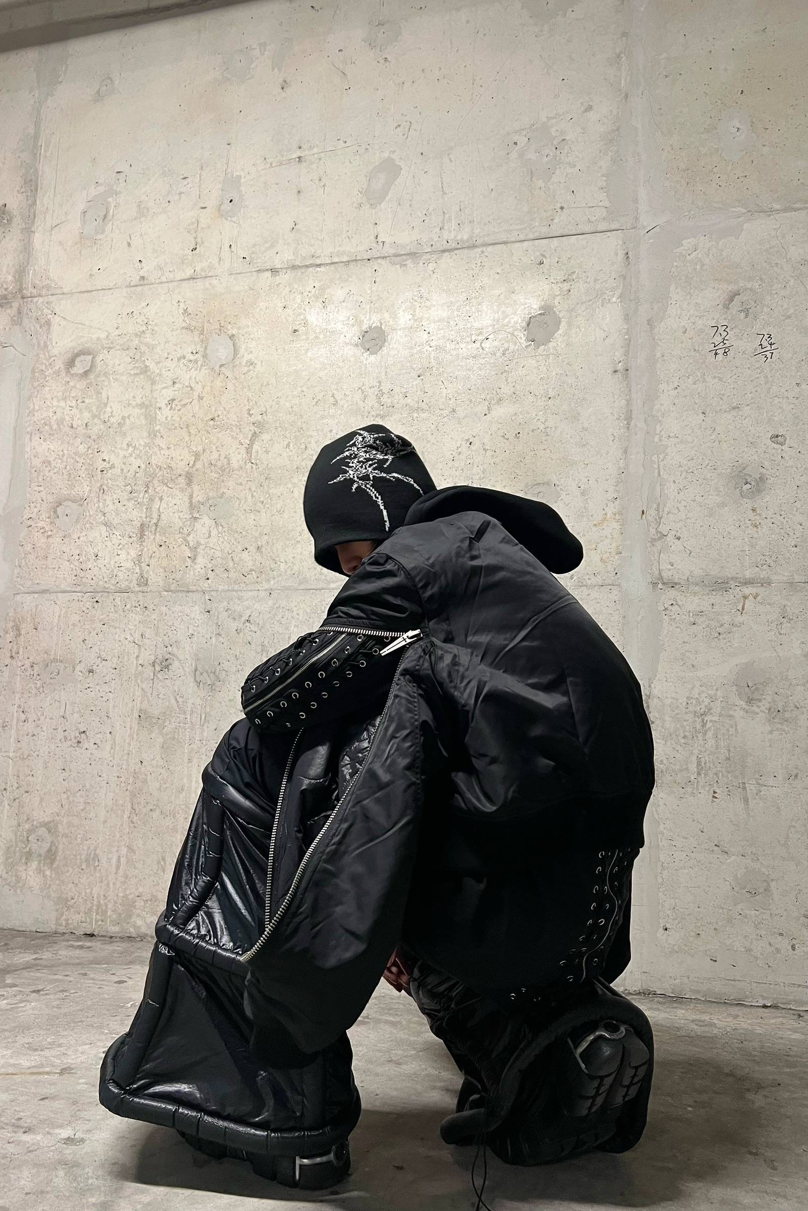 Featuring a double-zip design and striking bone prints. this organic hooded bomber redefines streetwear with a bold. futuristic edge