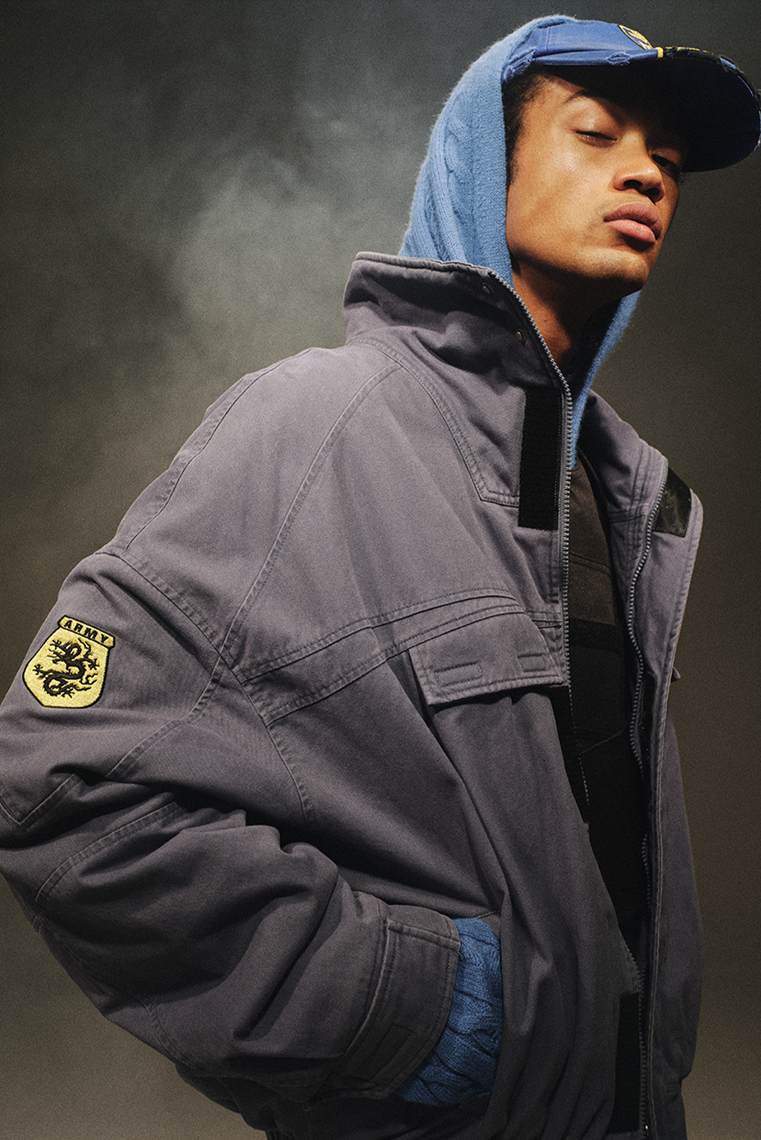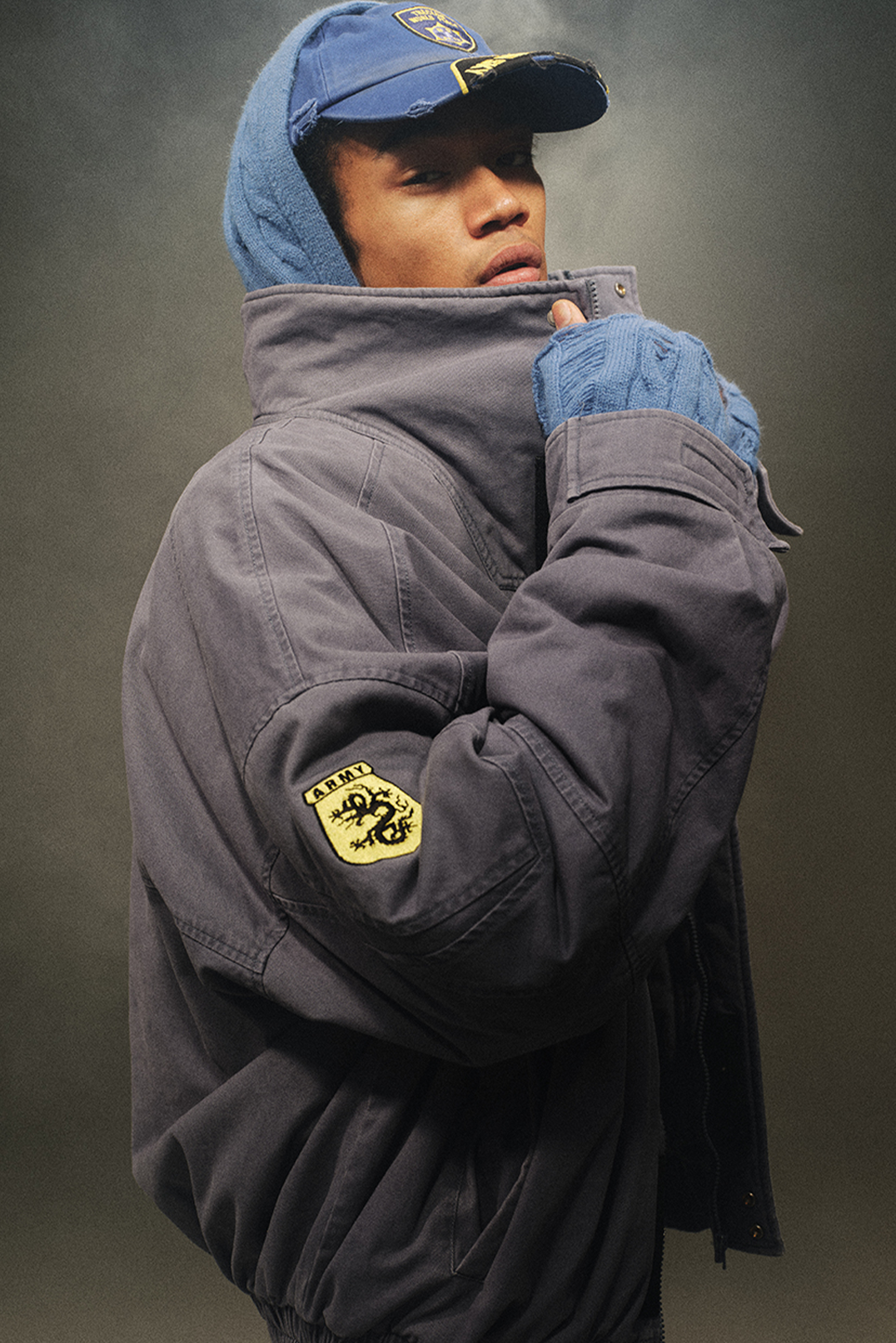 The windproof stand collar differentiates from standard hooded designs. The clean. sharp tailoring is complemented by vintage-style embroidery on the sleeves. Inspired by USA police uniform design. the overall structure features a dropped shoulder and a waist-cinching cut. with an interwoven shoulder construction that enhances shoulder tension. This creates a visually striking. sharp silhouette. highlighting a triangular body shape with broad shoulders.