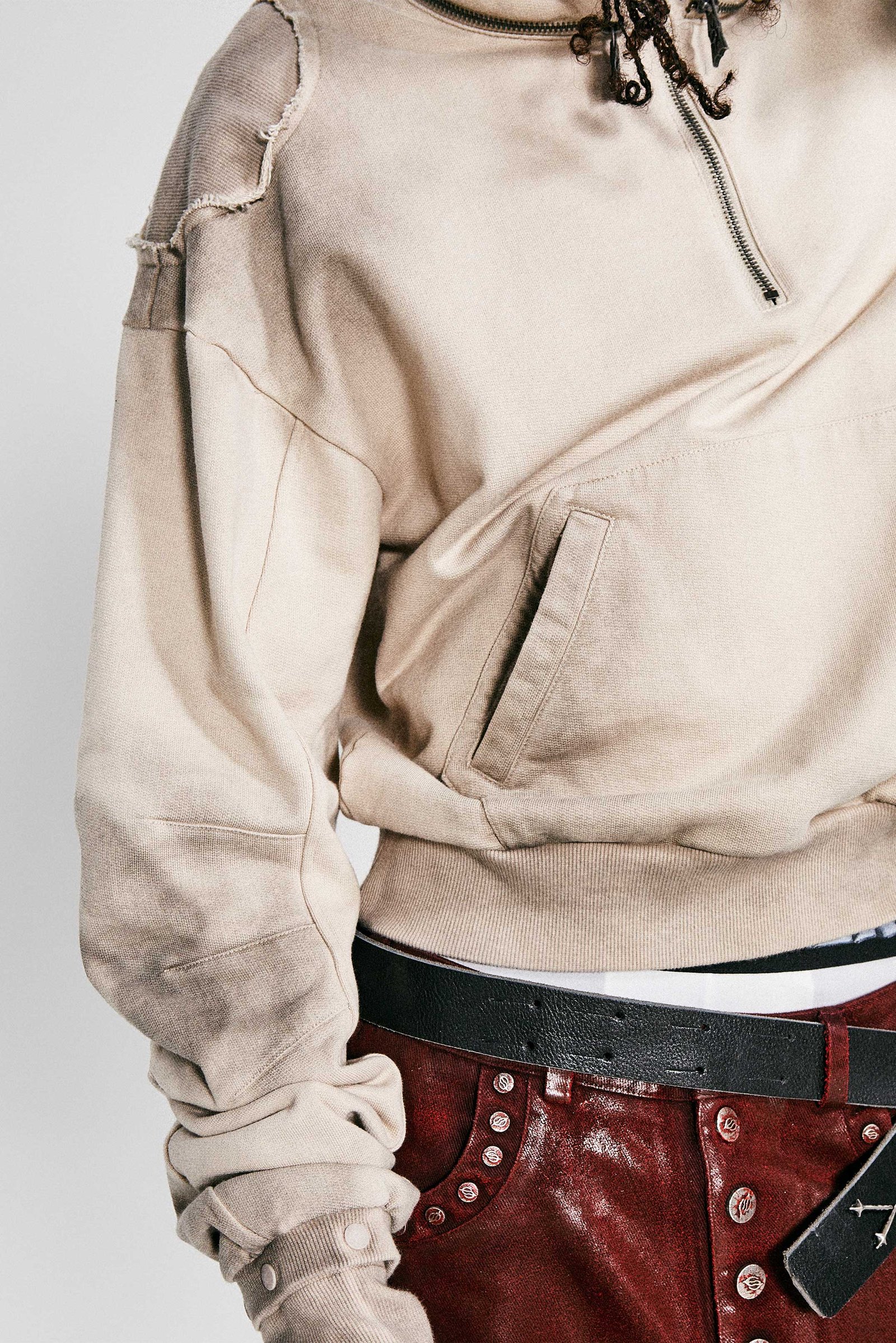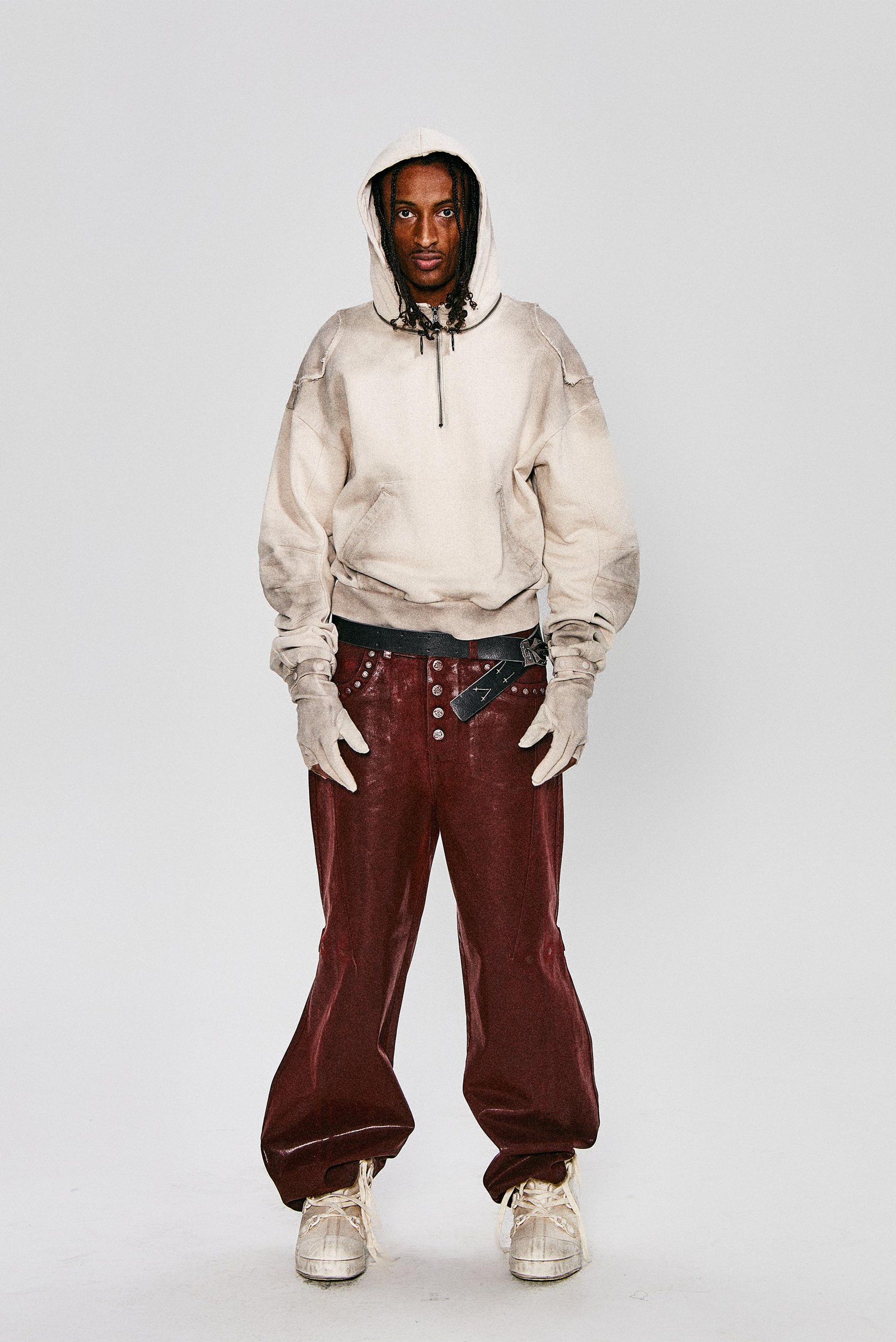 This season’s collection introduces a fresh design language. featuring curved blade sleeves paired with detachable gloves and a removable hood to expand styling versatility. The garment’s shoulders are constructed with ribbed fabric paneling. while intentional distressed spray treatment across the piece mimics time-worn textures. creating an artfully aged aesthetic. Merging modular functionality with raw-edge detailing. the design balances deconstructed utility and experimental craftsmanship. offering wearers a canvas that evolves with personalized use.