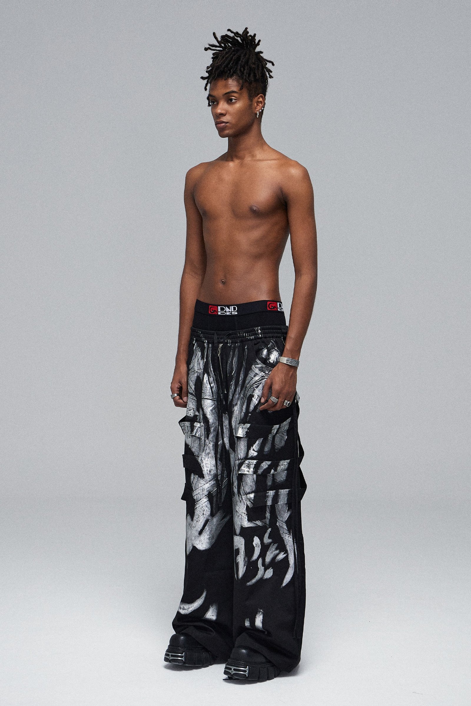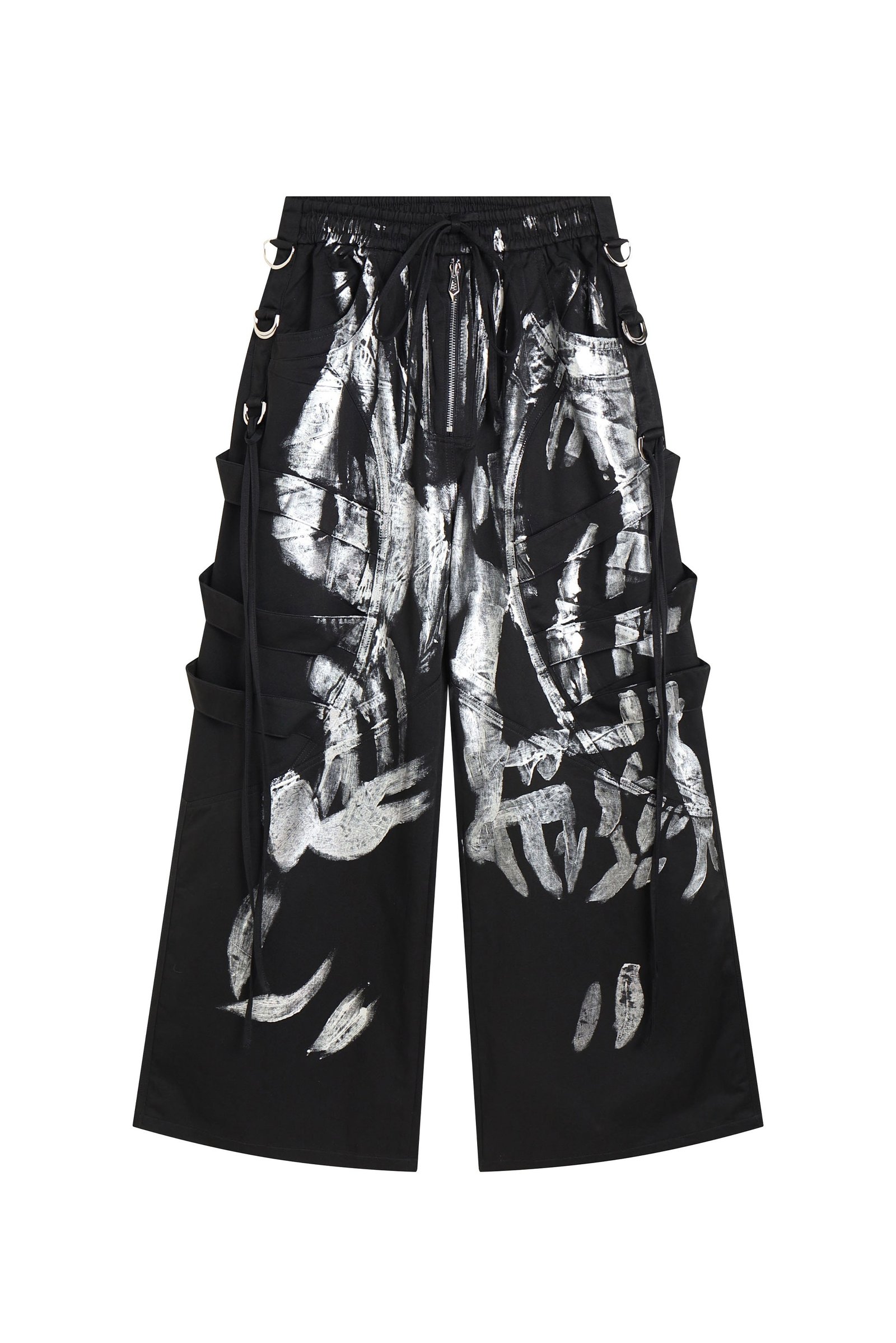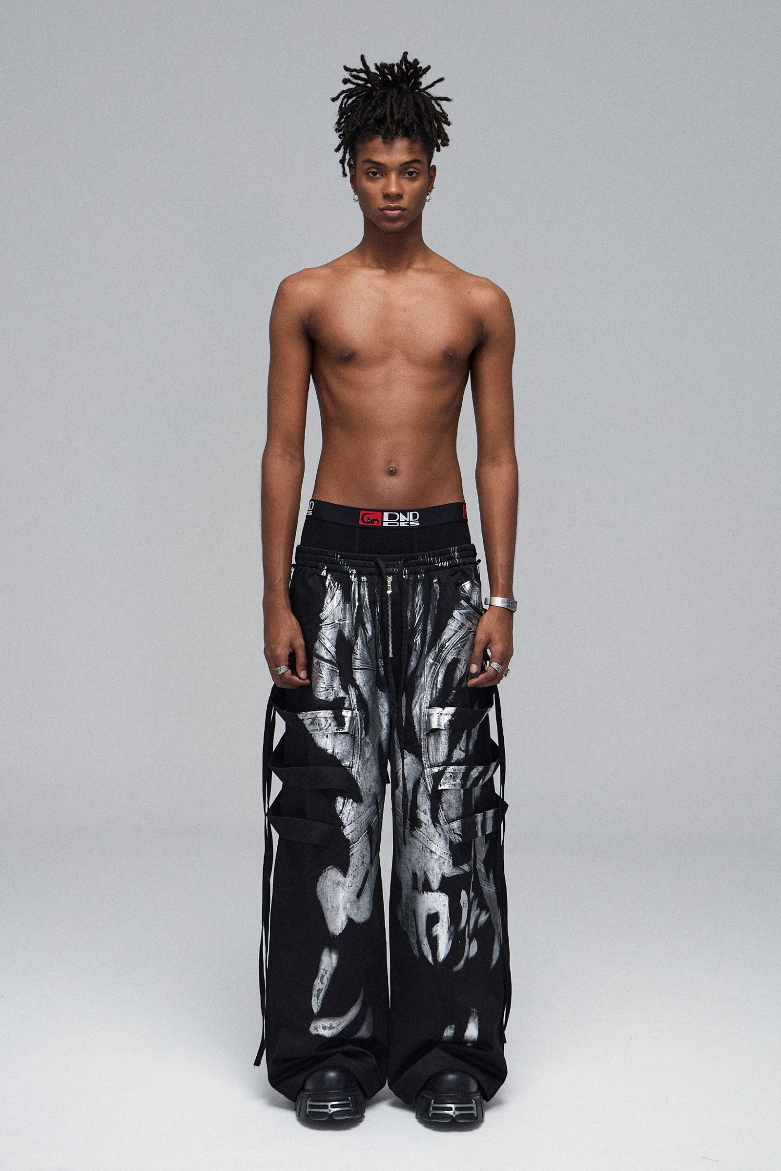 Inspired by rave pants. it retains a wide version and changes the traditional metallic feel. It uses straps. irregular structures and dancing ribbons. plus exaggerated full-length silver brushing to create a different rave pants.