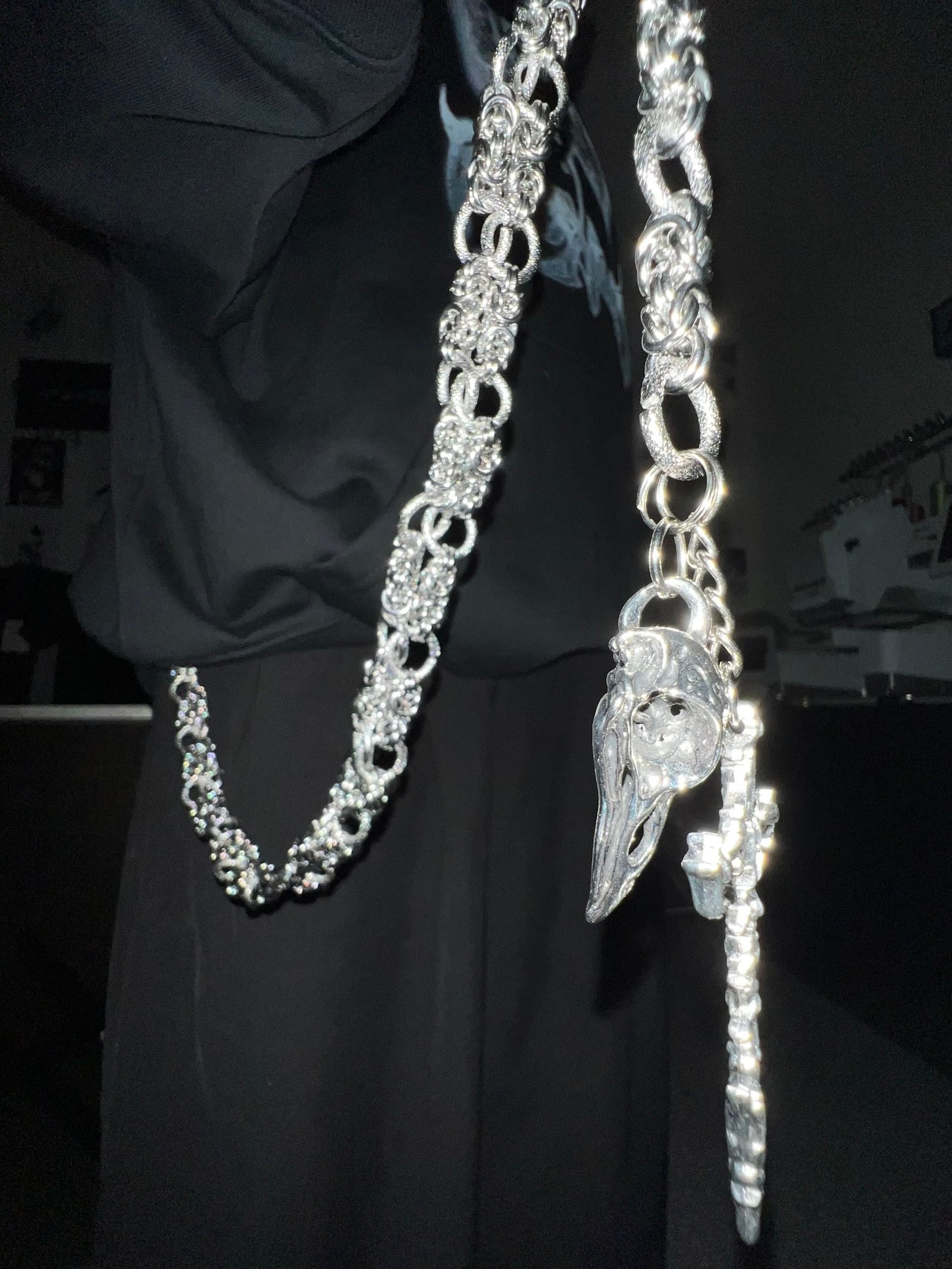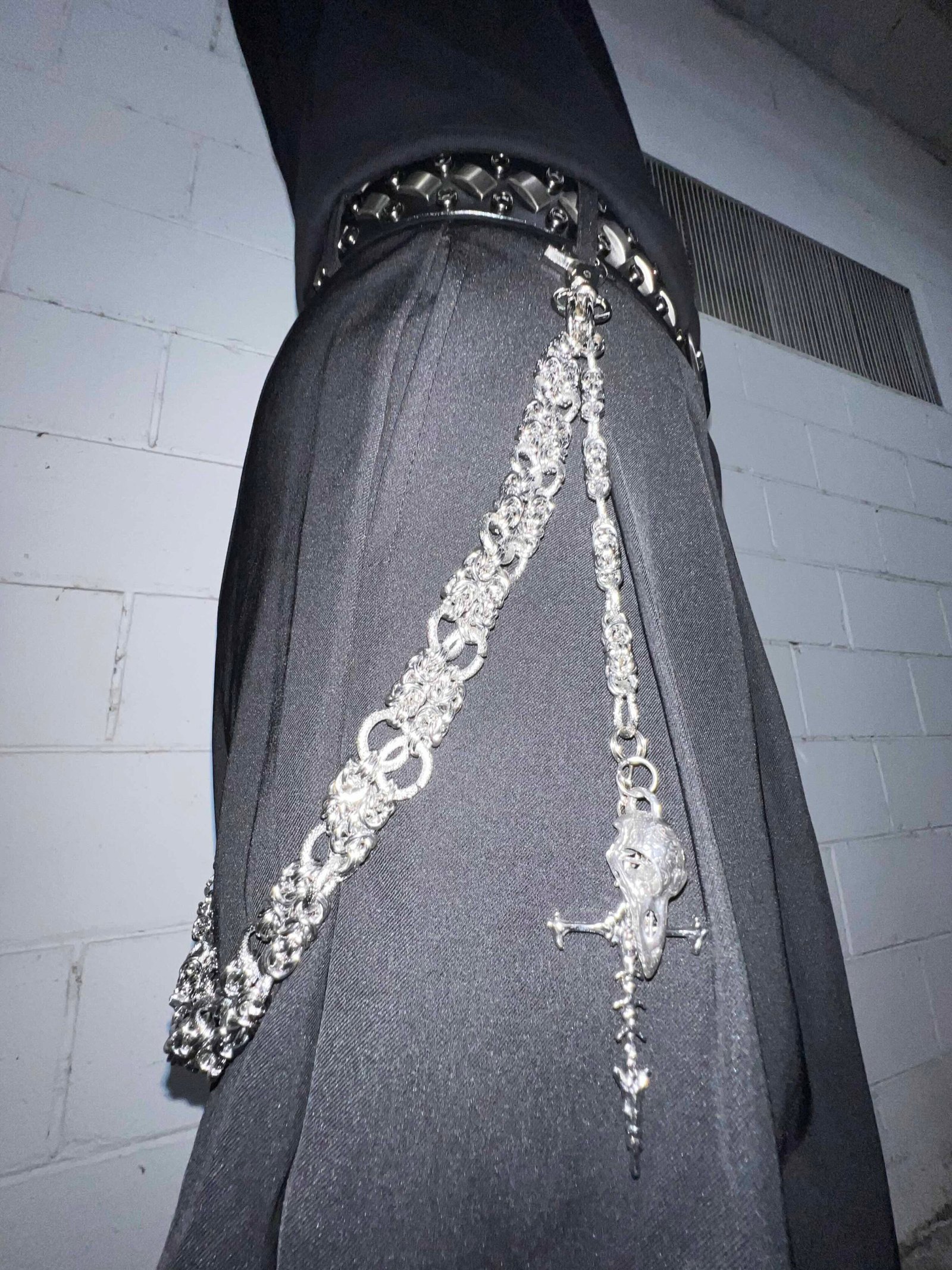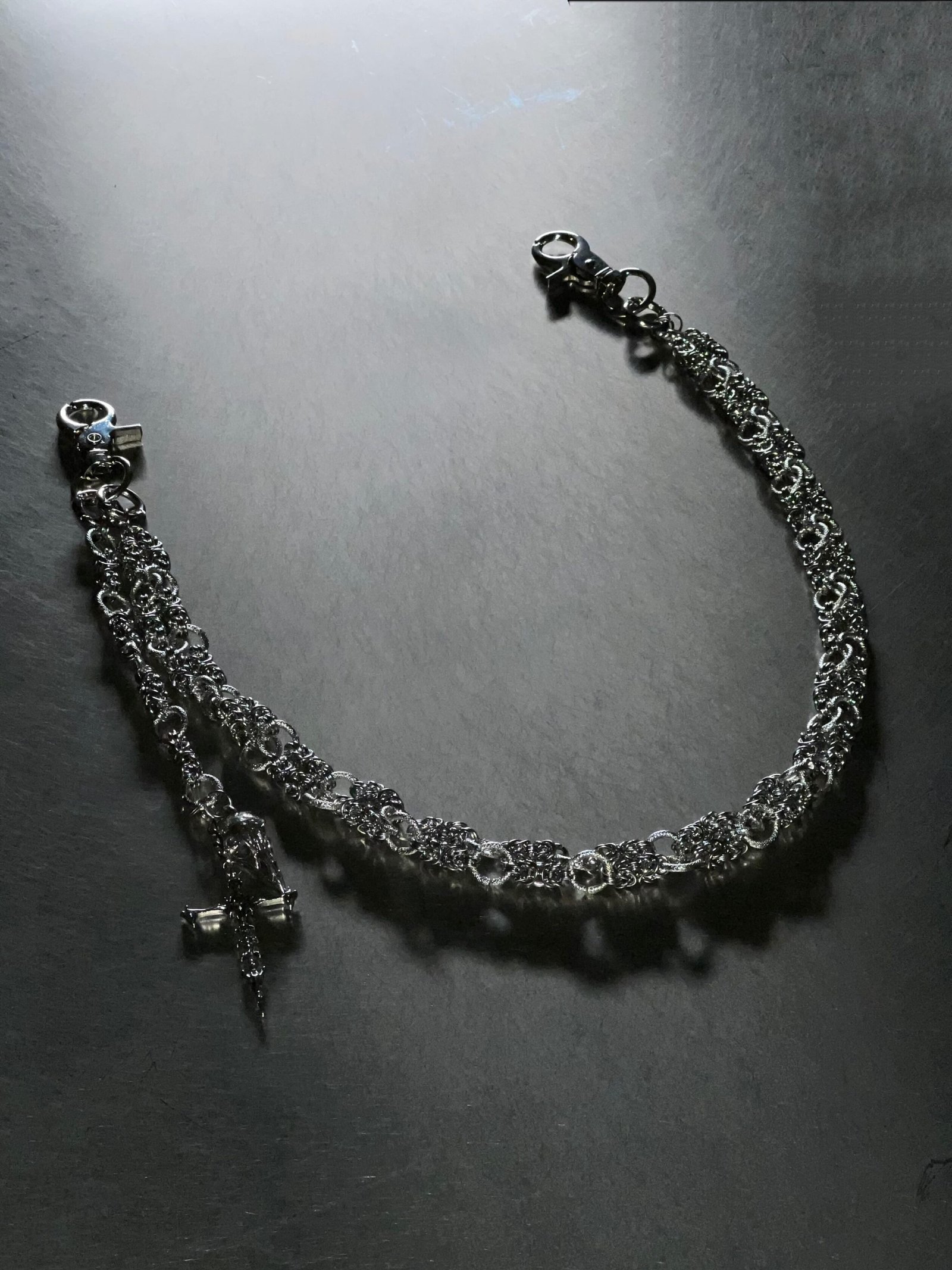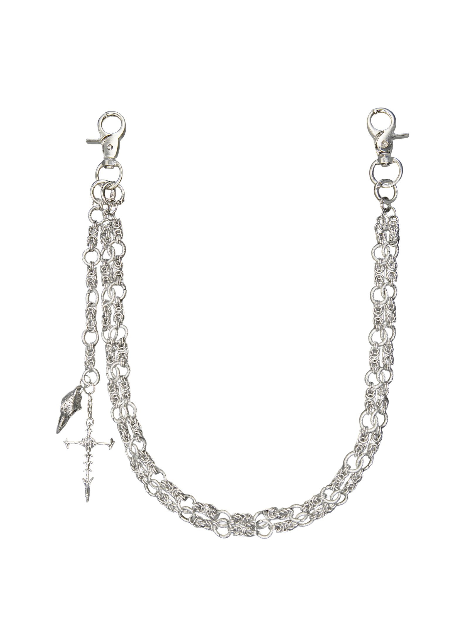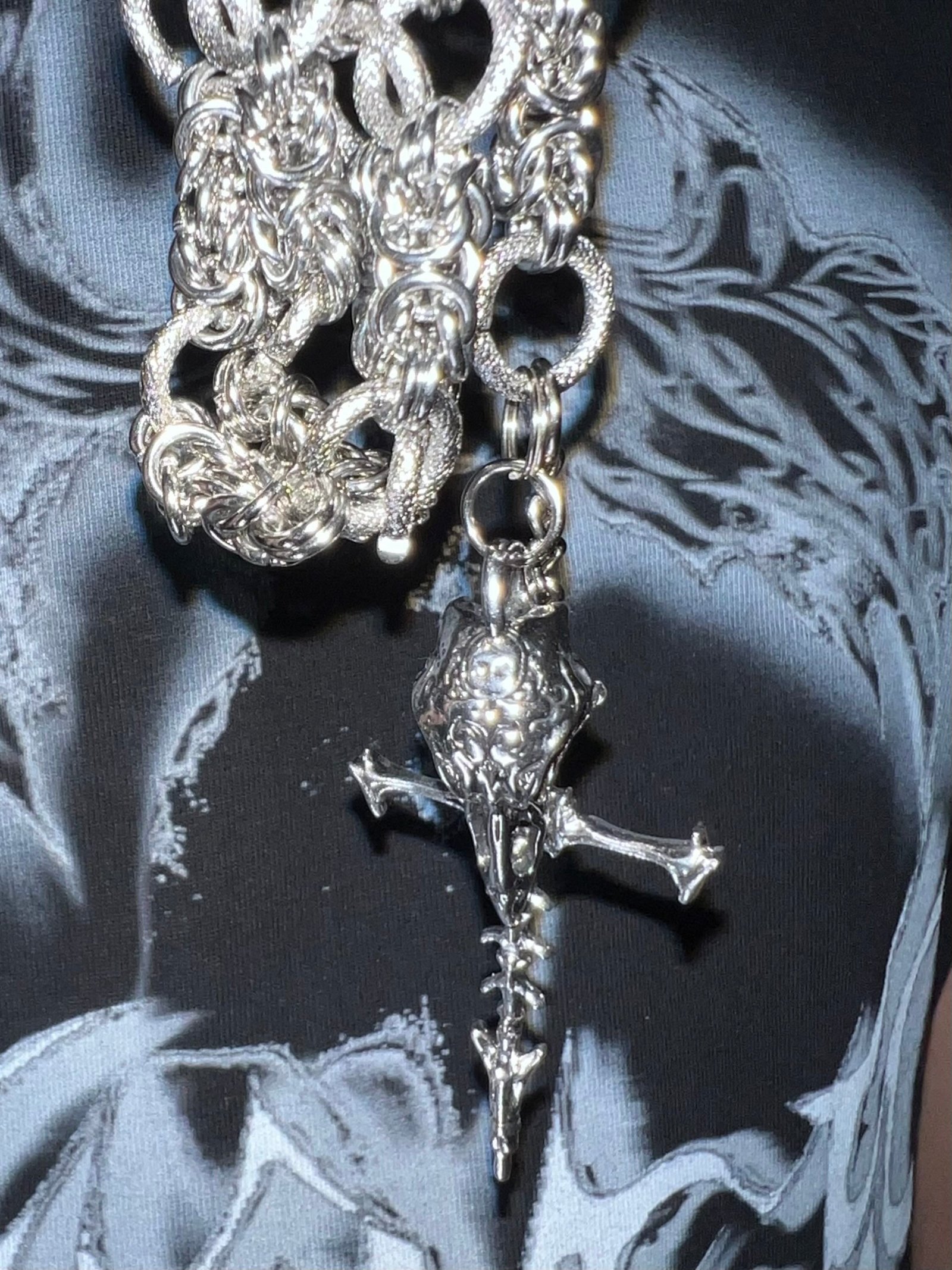 Handcrafted from solid titanium steel. this piece features a bold double-chain construction that blends density with finesse. The intricate weaving mimics a scale-like texture. giving the chain a structured yet fluid appearance. Finished with a bird skull and cross-shaped charm. the design introduces symbolic accents without overpowering the silhouette. The surface is electroplated to reflect shifting light and shadow. creating a sleek metallic luster. Built to last—resistant to rust. oxidation. and daily wear.
