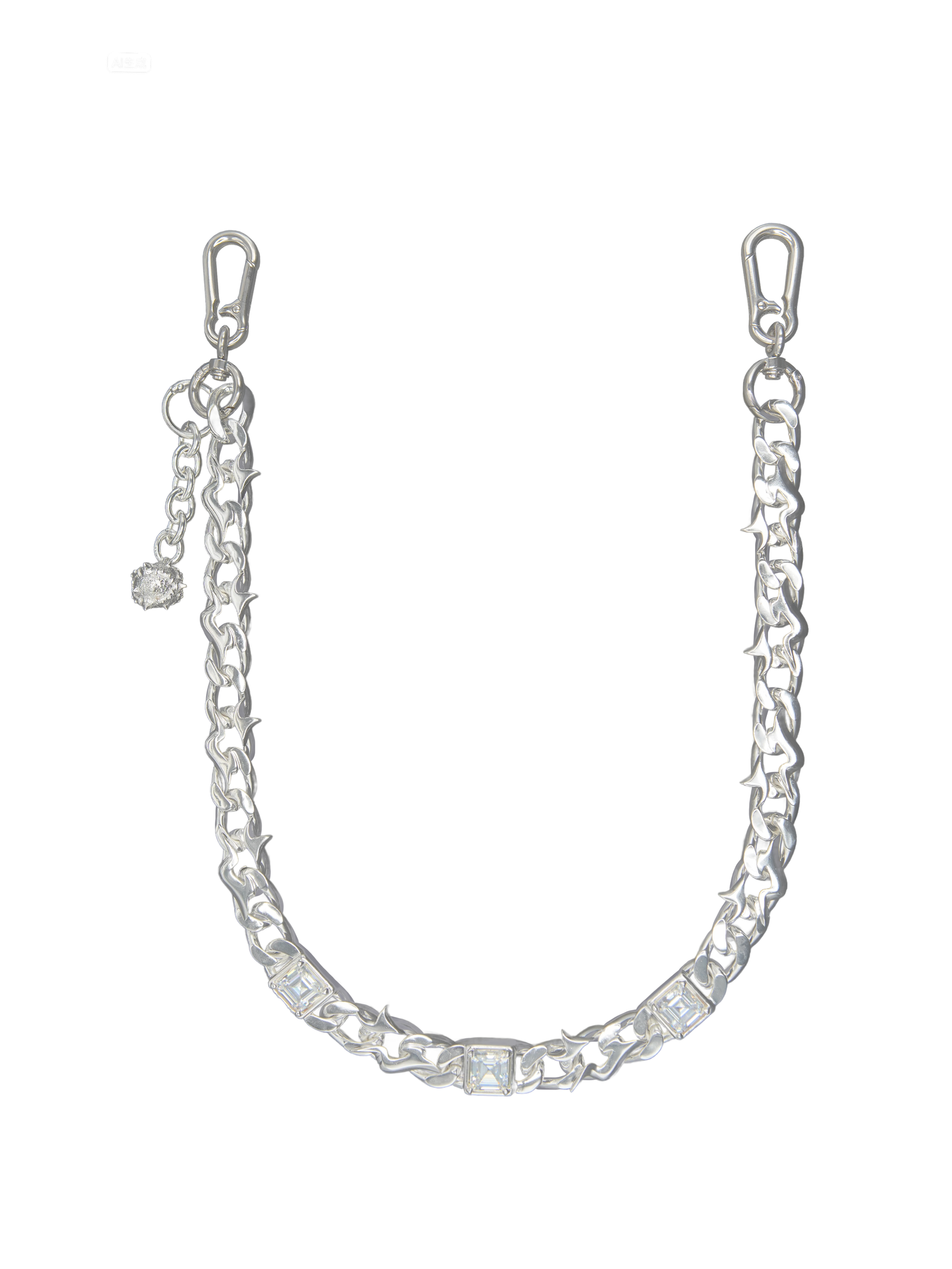 Built from copper with a silver-plated finish. this chain holds both weight and presence. Three Asscher-cut square zircon stones are precision-set into the flame-link body. throwing deep. mirror-like flashes with every move. Finished with a side-mounted warhammer pendant for a sharp. commanding edge.