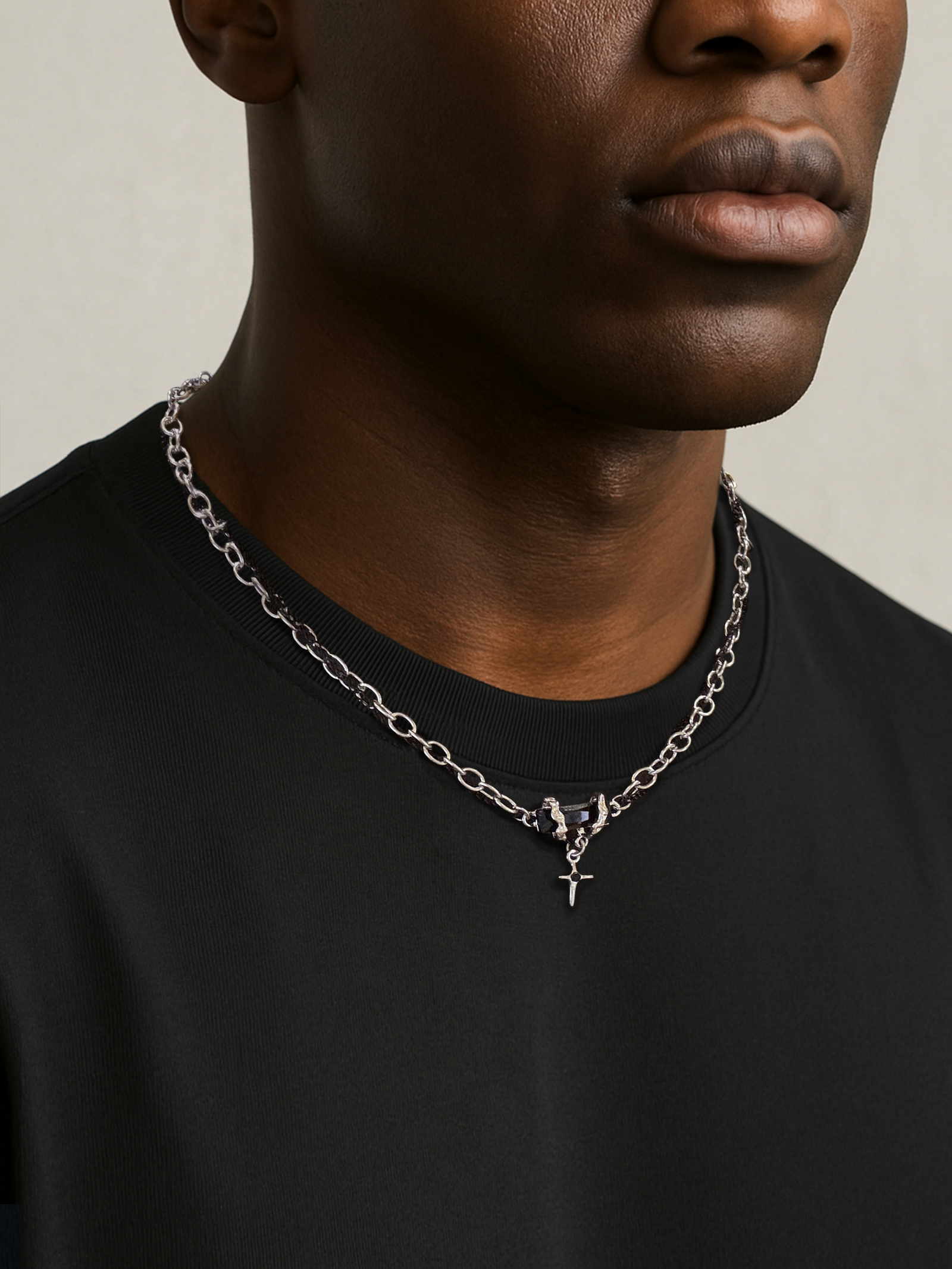 Handcrafted from premium titanium steel. VINEBIND necklace reinterprets control and tension with raw clarity. Dual chains intertwine around a black stone centerpiece. gripped by molten-like metal claws. A free-swinging cross drop adds motion to the stillness. Resistant to rust. oxidation. and wear. it’s built for everyday impact.