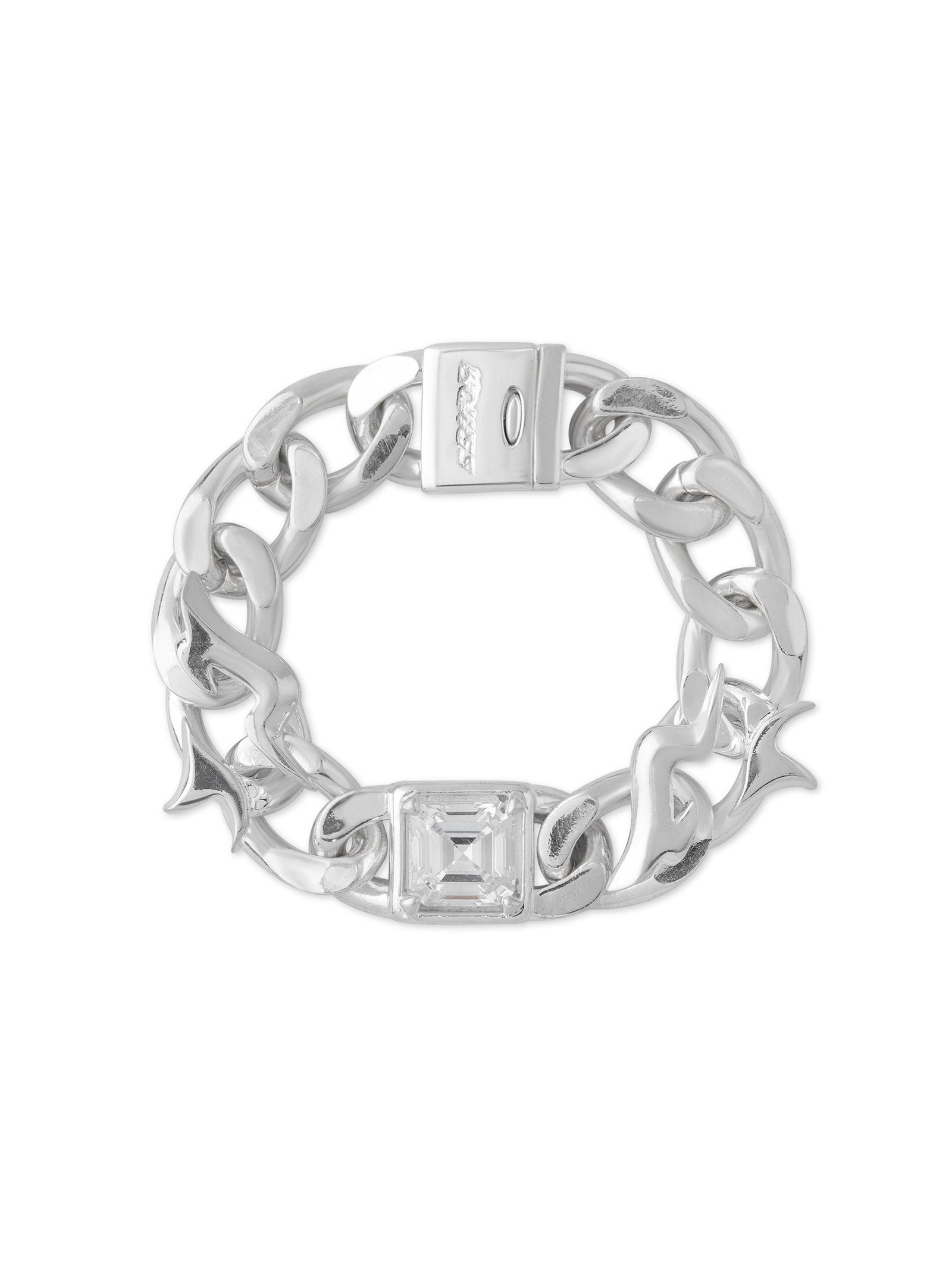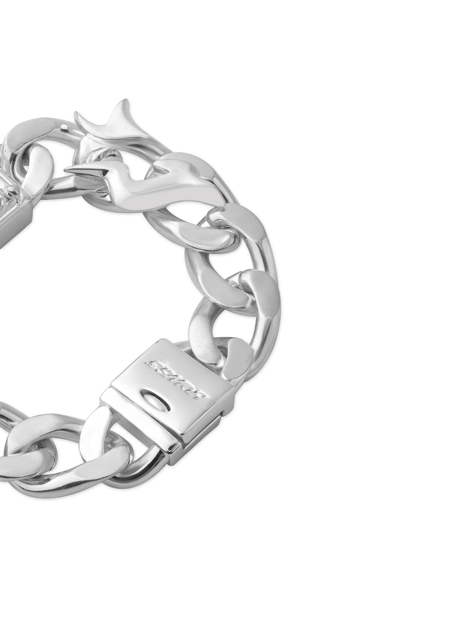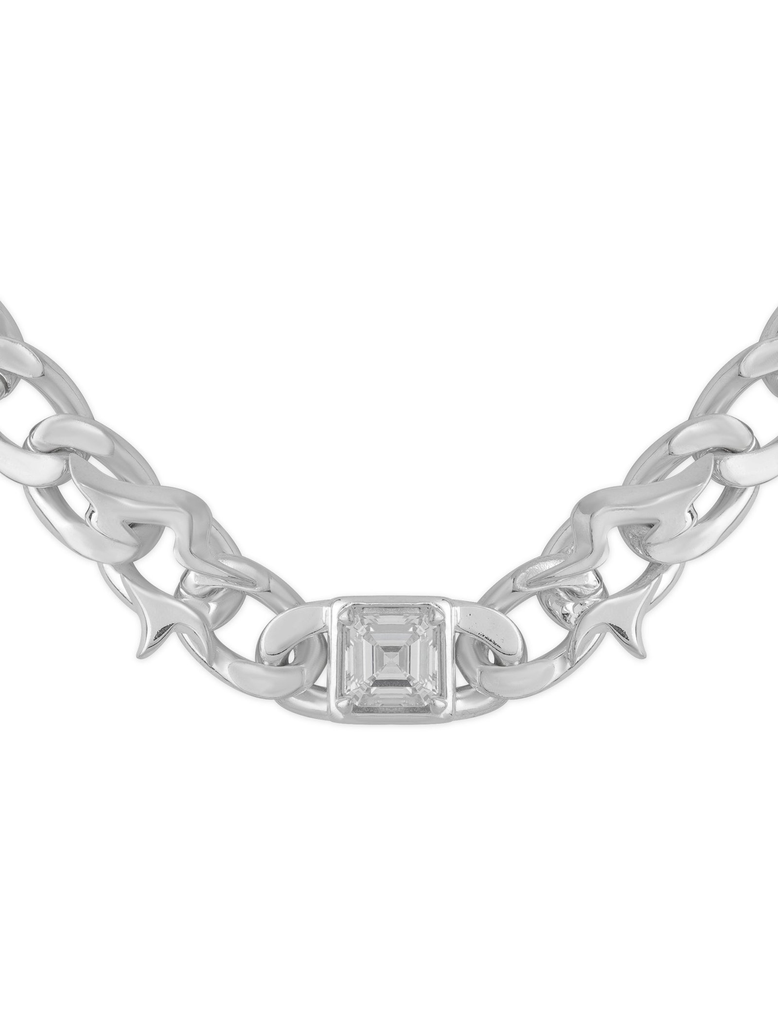 Built from copper with a silver-plated finish. this chain holds both weight and presence. Asscher-cut square zircons are precisely set on the flame chain body. throwing deep. mirror-like flashes with every move. Finished with a side-mounted warhammer pendant for a sharp. commanding edge.