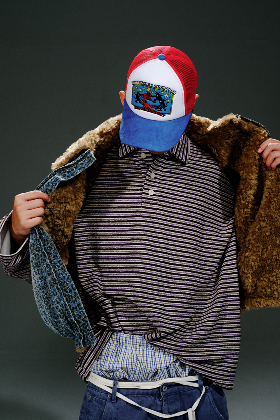 An unconventional silhouette with a drop-shoulder design. The fit is controlled through elastic adjustments at the armholes and hemline. The addition of faux goat fur on the back significantly enhances warmth. while the classic washed finish delivers an authentic vintage look.