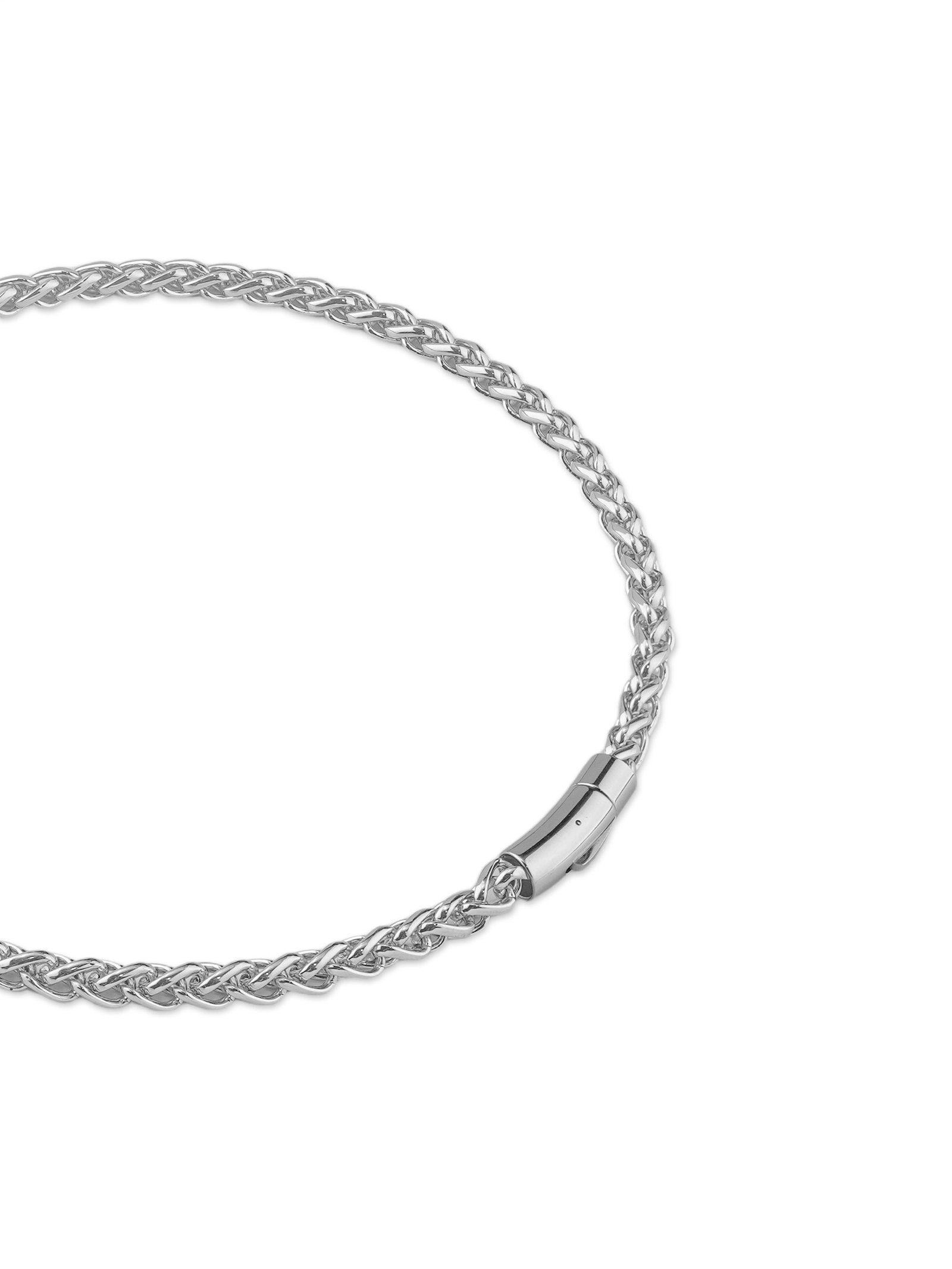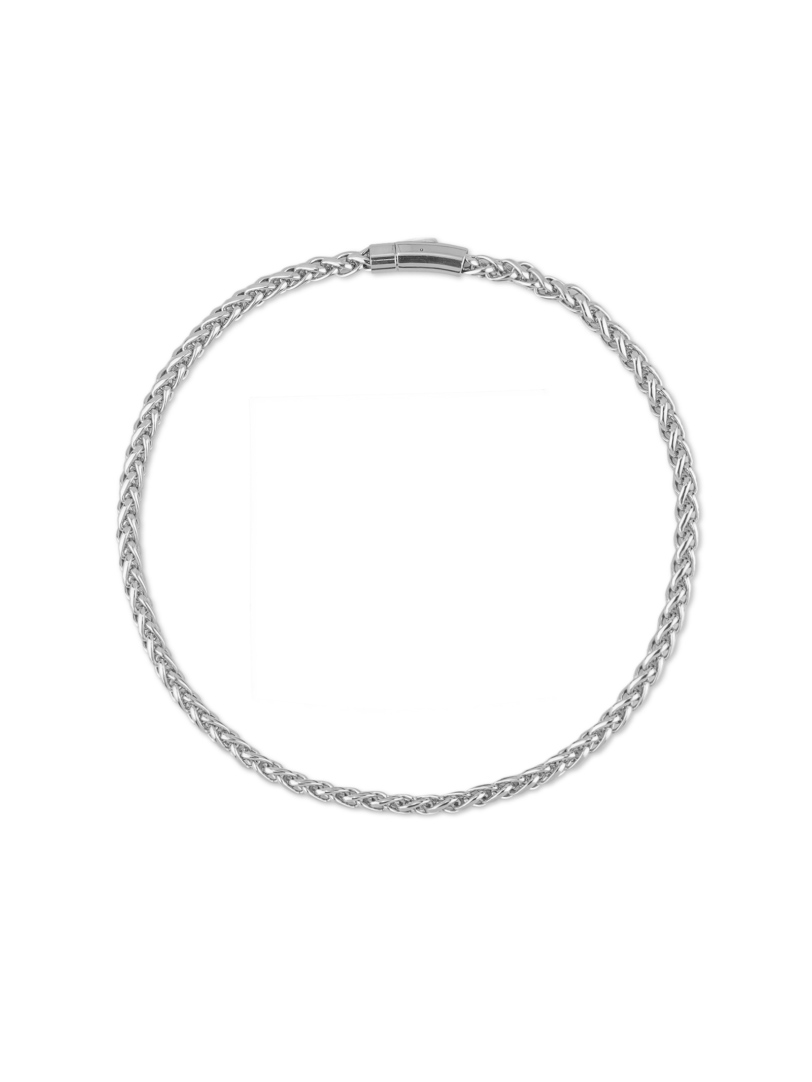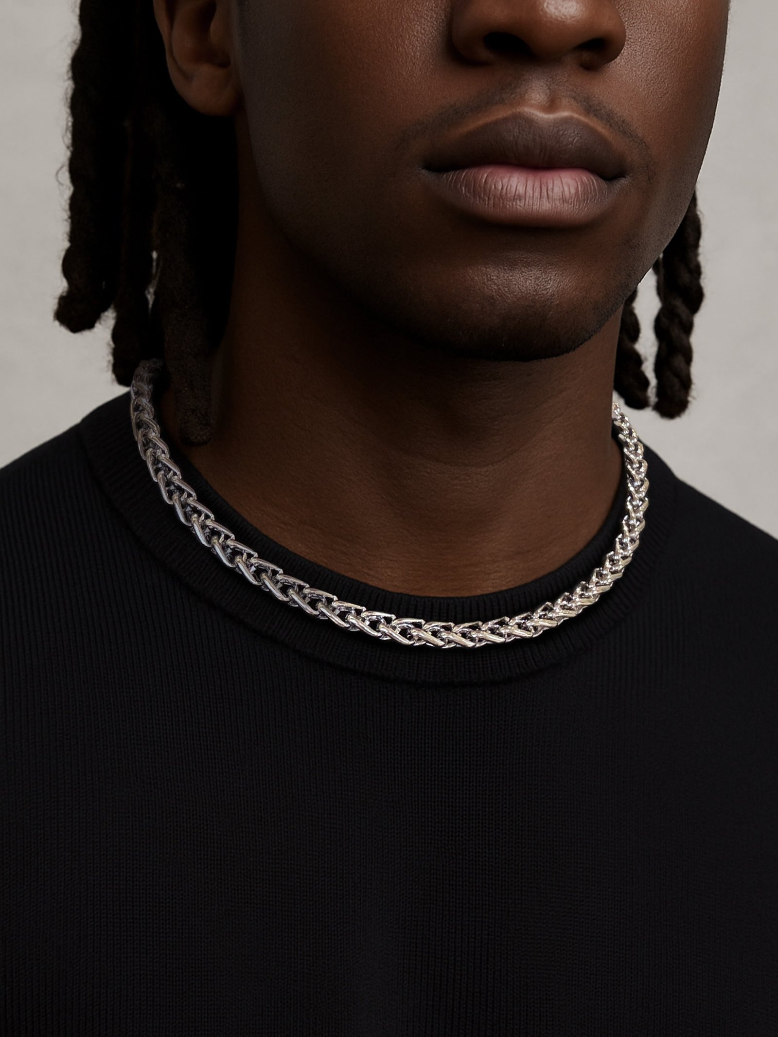 Defined by its smooth braided structure and polished titanium surface. this necklace exudes a quiet strength beneath its simple appearance. Designed to cling to the clavicle. its twisting links create a continuous flow – subtle. precise and unabashedly refined. It is resistant to oxidation. wear and the ravages of time.